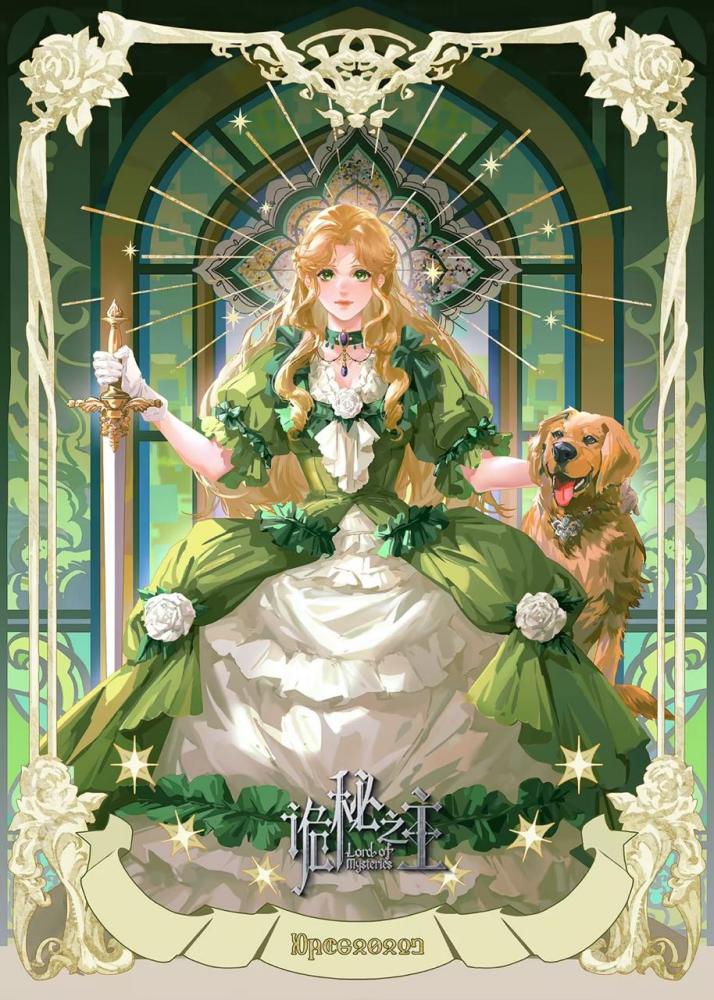 audrey_hall bad_link cathedral chinese_text church corset dress golden_retriever green_dress holding holding_sword holding_weapon justice_(tarot) lord_of_the_mysteries official_art sword tarot weapon