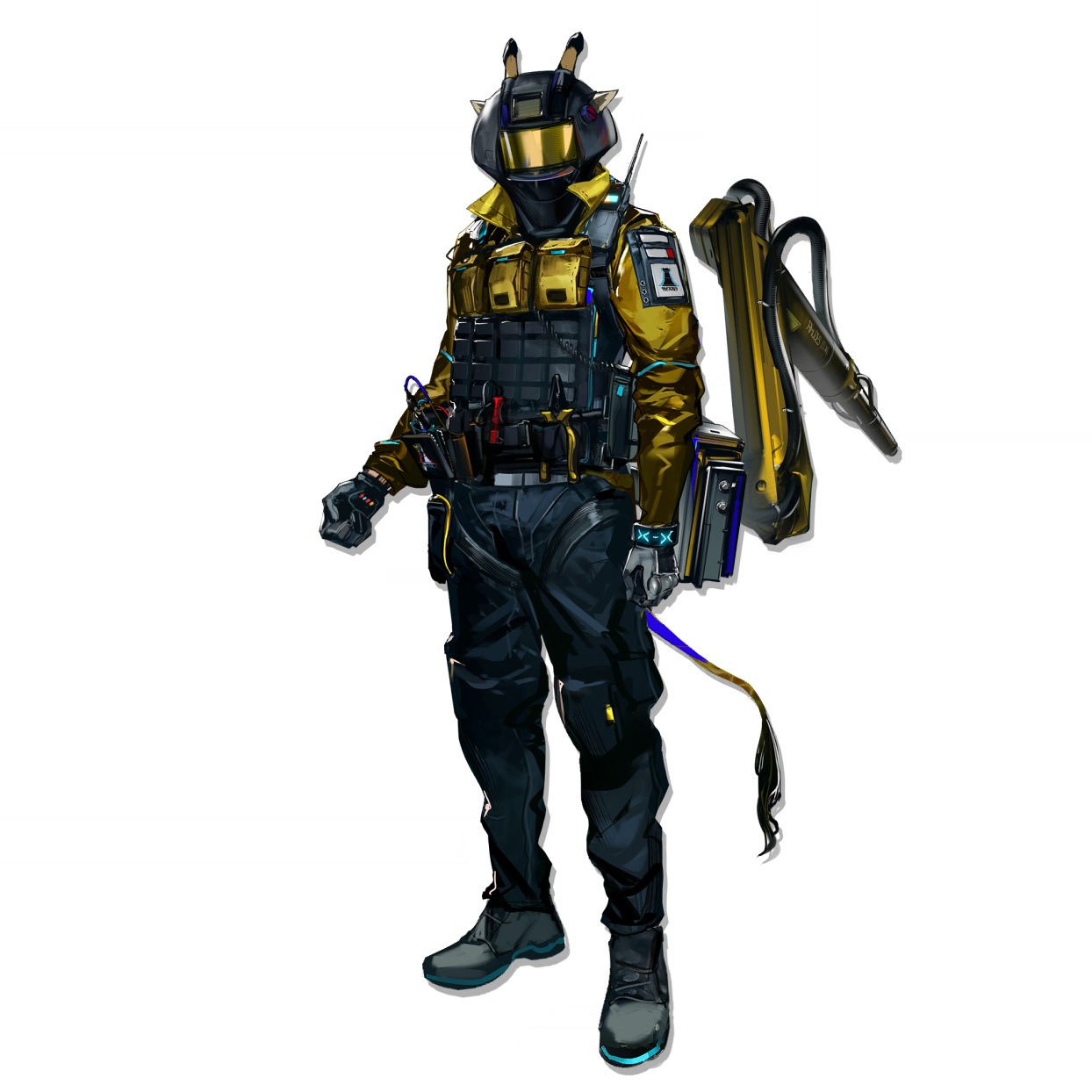 1boy ammunition_pouch animal_ears arknights bulletproof_vest extra_arms faceless faceless_male full_body giraffe_boy giraffe_ears giraffe_horns giraffe_tail highres horns infection_monitor_(arknights) load_bearing_vest male_focus mechanical_arms mechanist_(arknights) official_art pouch rhodes_island_logo_(arknights) rhodes_island_uniform simple_background single_mechanical_arm solo standing tachi-e tactical_clothes tail third-party_source transparent_background walkie-talkie