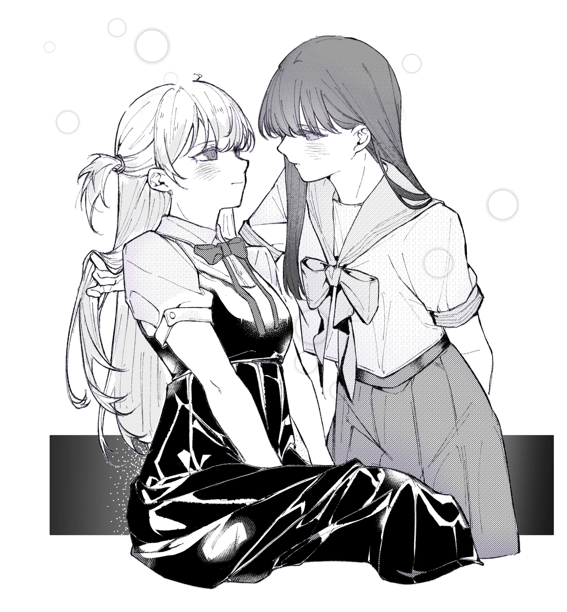2girls absurdres akebi-chan_no_serafuku akebi_komichi blush bow bowtie chinese_commentary closed_mouth commentary_request dress eye_contact hand_in_another's_hair haoxiangkan_nutong highres kizaki_erika long_hair looking_at_another multiple_girls one_eye_closed pinafore_dress pleated_skirt roubai_academy_school_uniform_(new) roubai_academy_school_uniform_(old) school_uniform serafuku shirt short_sleeves skirt sleeveless sleeveless_dress yuri