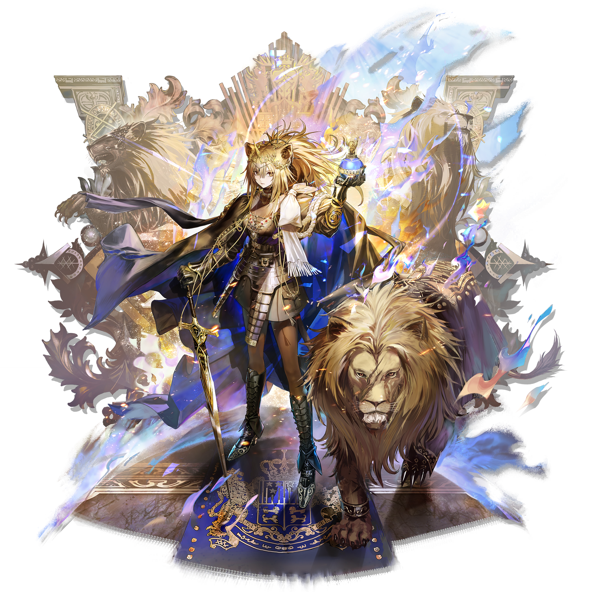 1girl animal animal_ears arknights armor armored_boots black_pantyhose black_skirt blonde_hair boots closed_mouth full_body gawain_(arknights) globus_cruciger highres holding holding_globus_cruciger holding_sword holding_weapon legs_apart lion lion_ears lion_girl lion_tail long_hair official_art pantyhose planted planted_sword planted_weapon serious siege_(arknights) simple_background skirt solo standing sword tachi-e tail third-party_source transparent_background vina_victoria_(arknights) weapon yellow_eyes