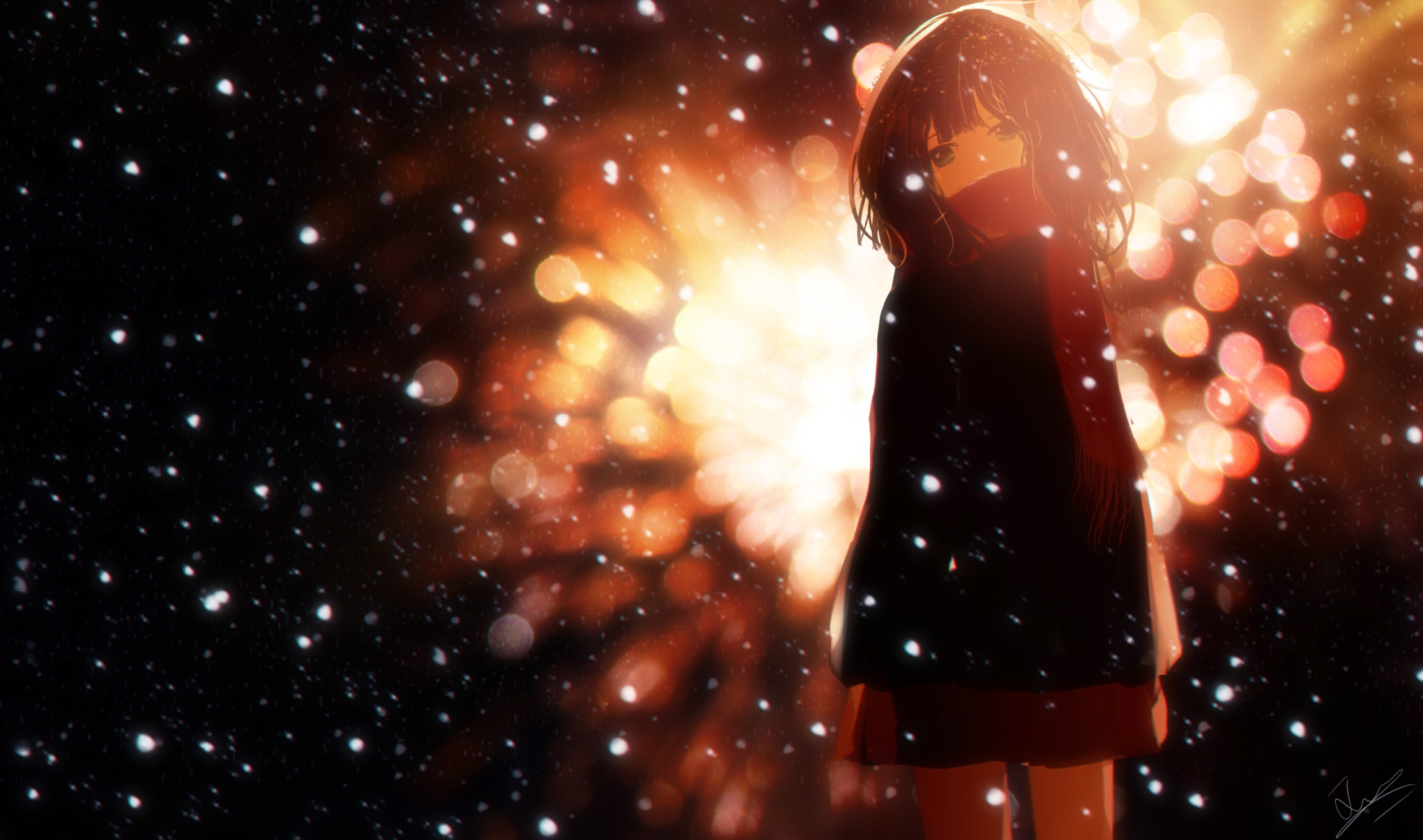 1girl aerial_fireworks backlighting black_coat black_eyes blurry blurry_background bokeh brown_hair coat covered_mouth cowboy_shot depth_of_field fireworks fringe_trim head_tilt highres huashijw light_particles long_sleeves looking_at_viewer medium_hair miniskirt night original outdoors red_scarf red_skirt scarf scarf_over_mouth signature skirt sky snow snowing solo standing winter winter_clothes