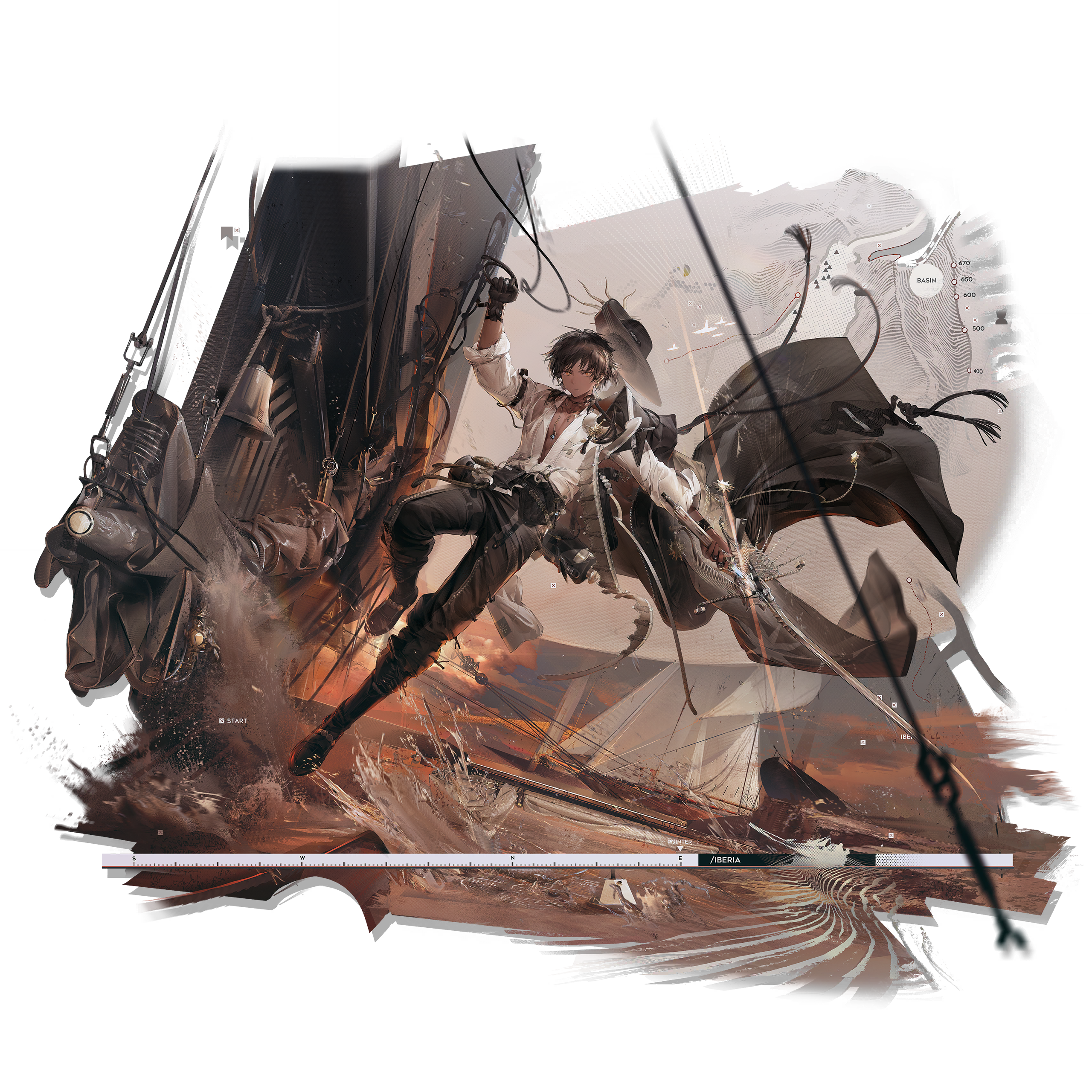 1boy absurdres arknights bishounen black_boots black_gloves black_hair black_pants boots braid bright_pupils brown_hair brown_theme closed_mouth dark-skinned_male dark_skin full_body gloves hat hat_loss highres holding holding_sword holding_weapon knee_boots looking_at_viewer male_focus ocean official_alternate_costume official_art open_clothes open_shirt orange_clouds orange_eyes orange_theme outdoors pants pectorals pirate sailing_ship serious ship shirt short_hair shuiyaoximushi simple_background sky sleeves_rolled_up solo standing sunset sword third-party_source thorns_(arknights) thorns_(blade-cleaved_tides)_(arknights) transparent_background unworn_hat unworn_headwear water watercraft weapon white_pupils white_shirt