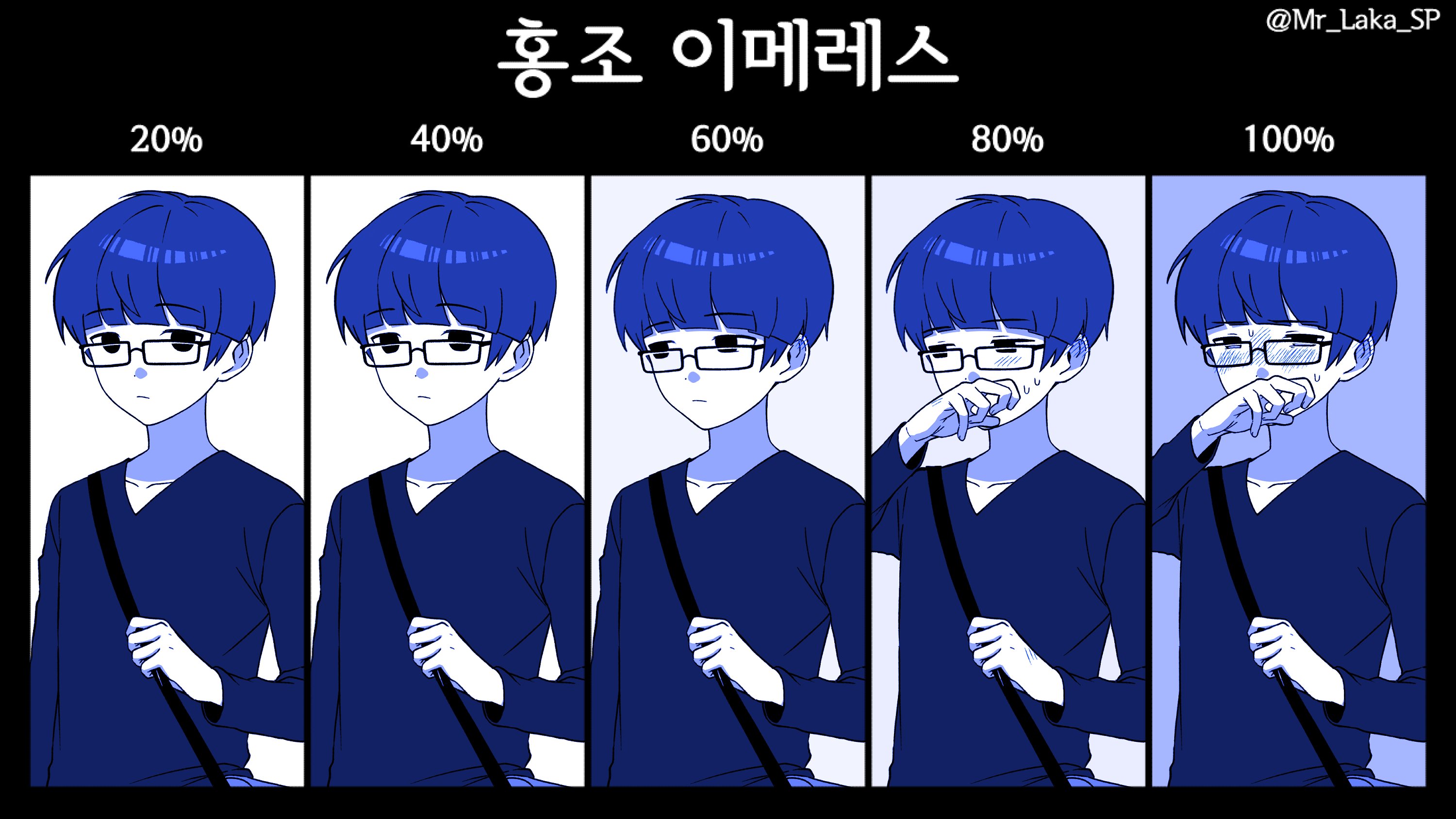1boy blue_hair blue_theme blunt_bangs bowl_cut crying glasses highres korean_commentary korean_text long_sleeves looking_at_viewer male_focus mossi_(mossi0816) multiple_expressions multiple_views pyo_ih-yeon shirt short_hair twitter_username upper_body zombie_high_school