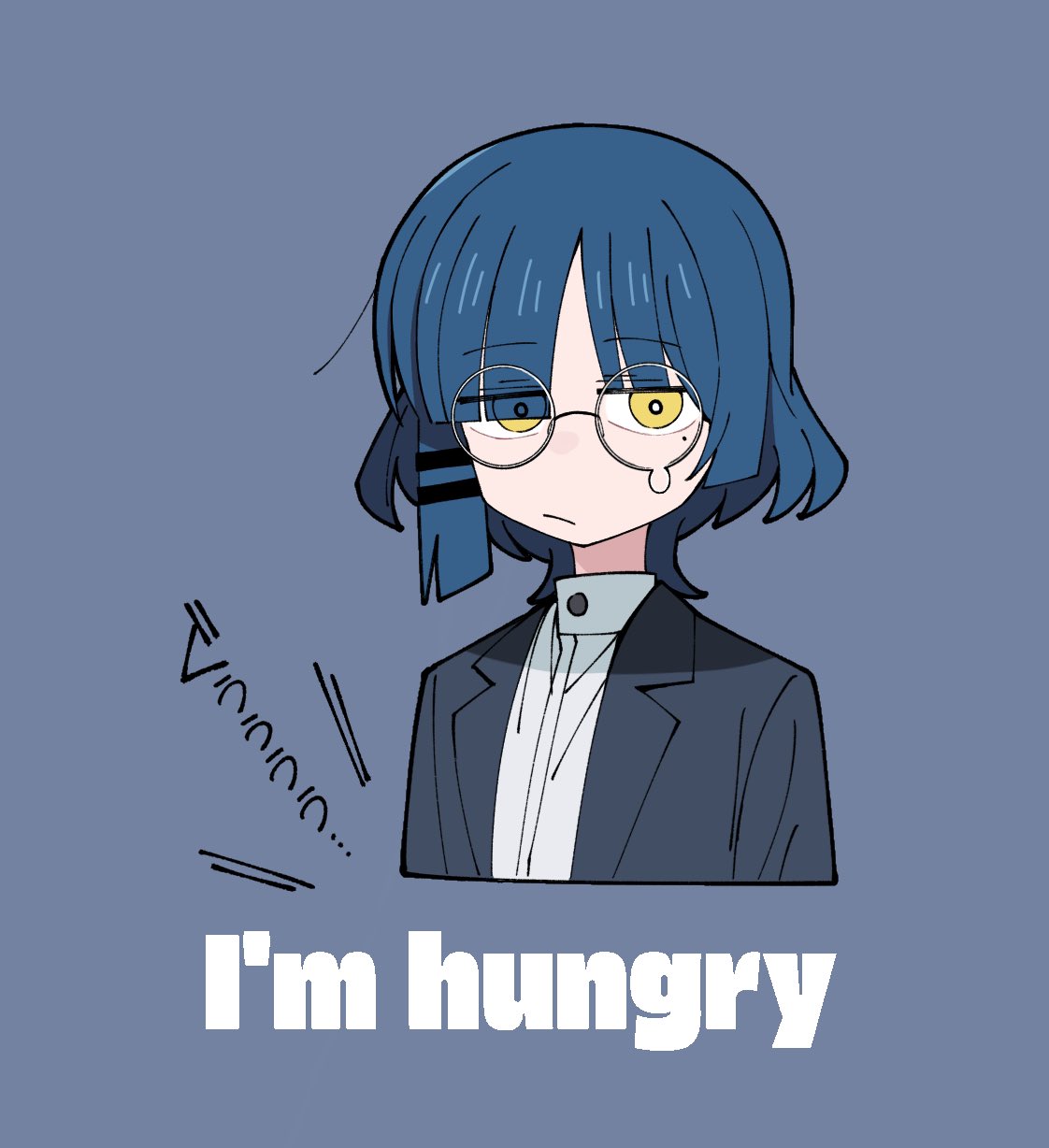 1girl asymmetrical_hair blue_background blue_hair blue_suit bocchi_the_rock! buttons closed_mouth cropped_torso english_text expressionless flat_color formal_clothes hair_ornament highres jitome mole mole_under_eye round_eyewear sabi1234 shirt short_hair simple_background single_tear solo suit upper_body white_shirt yamada_ryo yellow_eyes
