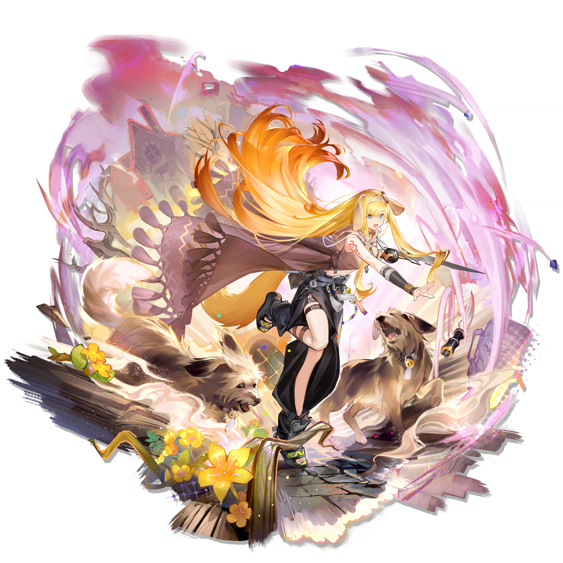 1girl animal animal_ears arknights arm_tattoo bag barking beads bell belt belt_pouch black_belt black_pants black_sandals blonde_hair blue_eyes boomerang brick_road brigid_(arknights) brown_cape brown_shirt cape clothing_cutout detached_sleeves dog dog_ears dog_girl dog_tail dropped_object floating floating_hair floppy_ears flower full_body gradient_hair hair_floating_upwards hairband highres holding_boomerang hood hood_down hooded_shirt house knife leaning_forward leg_cutout leg_up long_hair looking_at_object looking_down midriff multicolored_hair multiple_dogs neck_bell official_art open_mouth orange_hair outdoors outstretched_arm pants platform_sandals pouch reaching sandals shirt sidelocks simple_background sleeveless sleeveless_shirt solo standing standing_on_one_leg swept_bangs tail tassel tattoo thigh_belt thigh_strap third-party_source tiptoes transparent_background very_long_hair white_hairband yellow_flower yukuso_(dabiandang) zipper_pull_tab