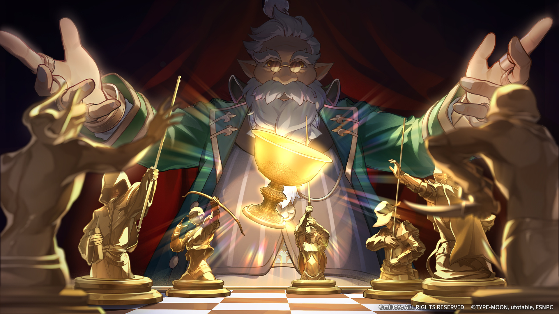 1boy bad_link beard board_game chess chessboard copyright_notice curtains facial_hair game_cg glasses green_jacket highres holy_grail_(fate) honkai:_star_rail honkai_(series) indoors jacket jewelry long_sleeves looking_at_viewer male_focus multiple_rings official_art old old_man oti_alfalfa outstretched_arms pince-nez pointy_ears ponytail ring short_hair solo thick_eyebrows white_hair yellow_eyes