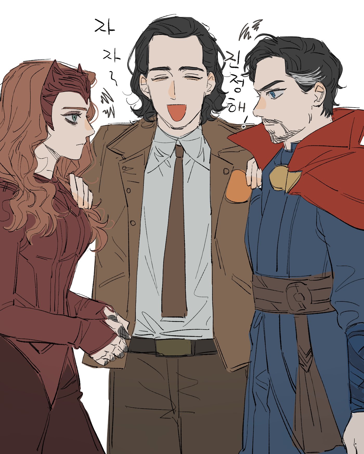 1girl 2boys animification belt black_belt black_eyeshadow black_hair blue_eyes blue_shirt breasts bridal_gauntlets brown_belt brown_jacket brown_necktie brown_pants cloak closed_eyes closed_mouth collared_shirt commentary_request cowboy_shot doctor_strange doctor_strange_(series) doctor_strange_in_the_multiverse_of_madness dress eyeshadow facial_hair formal_clothes green_eyes half-closed_eyes hand_on_another's_shoulder hands_up highres jacket korean_commentary korean_text lapels loki_(disney+) loki_(marvel) long_hair long_sleeves looking_at_another makeup marvel mask mask_on_head medium_breasts multicolored_hair multiple_boys necktie open_clothes open_jacket open_mouth orange_hair pants puffy_long_sleeves puffy_sleeves red_cloak red_dress red_mask scarlet_witch shirt short_hair sidelocks simple_background smile squiggle standing streaked_hair sunwillshineon wanda_maximoff wavy_hair white_background white_hair white_shirt