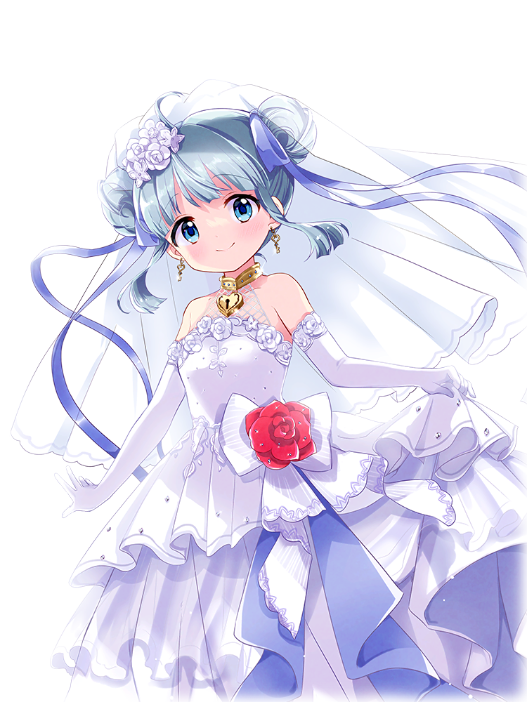 1girl aqua_hair bare_shoulders blue_bow blue_eyes blunt_bangs bow breasts bridal_gauntlets bridal_veil clea_(kirara_fantasia) cowboy_shot double_bun dress earrings elbow_gloves flat_chest floating_hair flower frills gloves hair_bow hair_bun hair_flower hair_ornament hara_yui jewelry keyhole kirara_fantasia official_alternate_costume official_art pendant skirt_hold smile solo standing strapless strapless_dress veil wedding wedding_dress white_bridal_gauntlets white_dress white_gloves