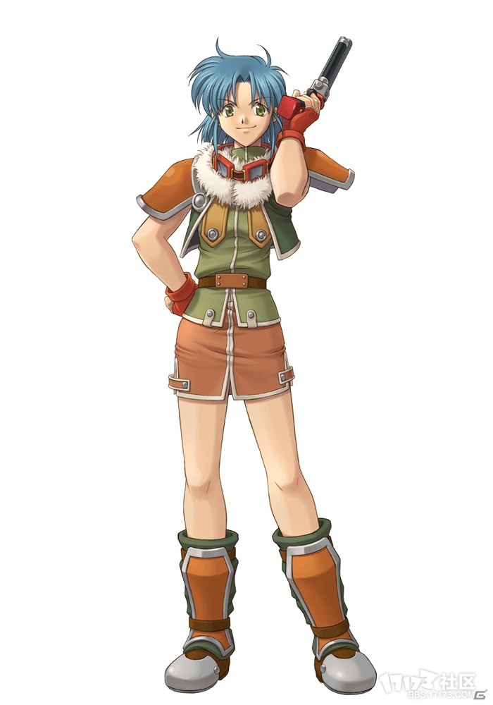 1girl armor belt blue_hair boots curtained_hair eiyuu_densetsu fingerless_gloves full_body fur_trim gloves goggles goggles_around_neck green_eyes green_shirt green_vest gun hand_on_own_hip handgun holding holding_gun holding_weapon josette_capua leather leather_gloves light_smile looking_at_viewer medium_hair miniskirt official_art orange_skirt parted_bangs red_gloves shirt shoulder_armor skirt sleeveless sleeveless_shirt smile smug solo sora_no_kiseki third-party_source vest weapon