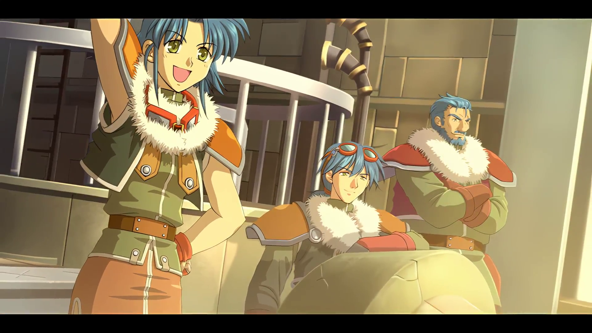1girl 2boys armor beard belt blue_facial_hair blue_hair closed_mouth crossed_arms curtained_hair don_capua eiyuu_densetsu facial_hair fingerless_gloves fur_trim game_cg gloves goggles goggles_around_neck goggles_on_head green_eyes green_shirt green_vest hair_between_eyes hand_on_own_hip highres indoors josette_capua kyle_capua leather leather_gloves letterboxed looking_to_the_side multiple_boys mustache official_art open_clothes open_mouth open_vest orange_skirt parted_bangs shirt short_hair shoulder_armor skirt smile sora_no_kiseki standing third-party_source vest