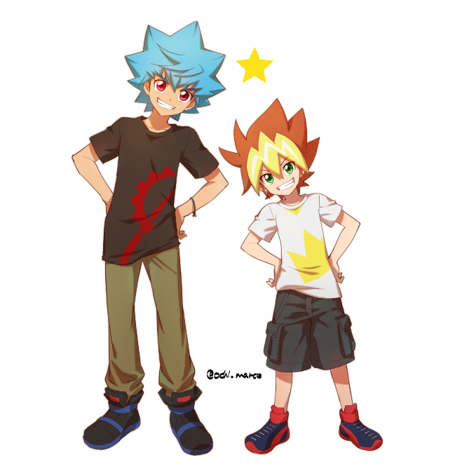 2boys black_shirt black_shorts blonde_hair blue_hair brown_eyes brown_hair character_request full_body green_eyes hands_on_own_hips male_focus multicolored_hair multiple_boys ochi_marco shirt shorts simple_background spiked_hair two-tone_hair white_shirt yu-gi-oh! yu-gi-oh!_sevens