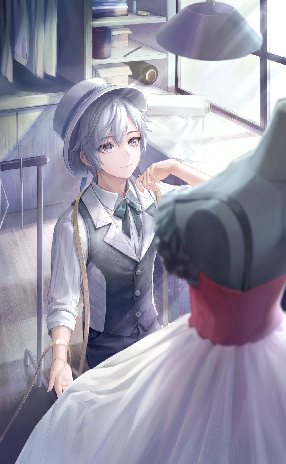 1boy artist_request black_bow black_bowtie black_pants black_vest bow bowtie buttons ceiling_light closed_mouth collared_shirt collared_vest cowboy_shot day dress dress_pants fabric game_cg grey_eyes grey_hair grey_hat hair_between_eyes happy hat helz_(shining_nikki) highres indoors lapels light_rays looking_at_object loose_hair_strand mannequin nikki_(series) notched_lapels official_art on_stool pants pen pocket sewing shining_nikki shirt short_hair sitting smile solo striped_clothes striped_shirt studio sunlight unworn_dress vertical-striped_clothes vertical-striped_shirt vest white_shirt wooden_floor