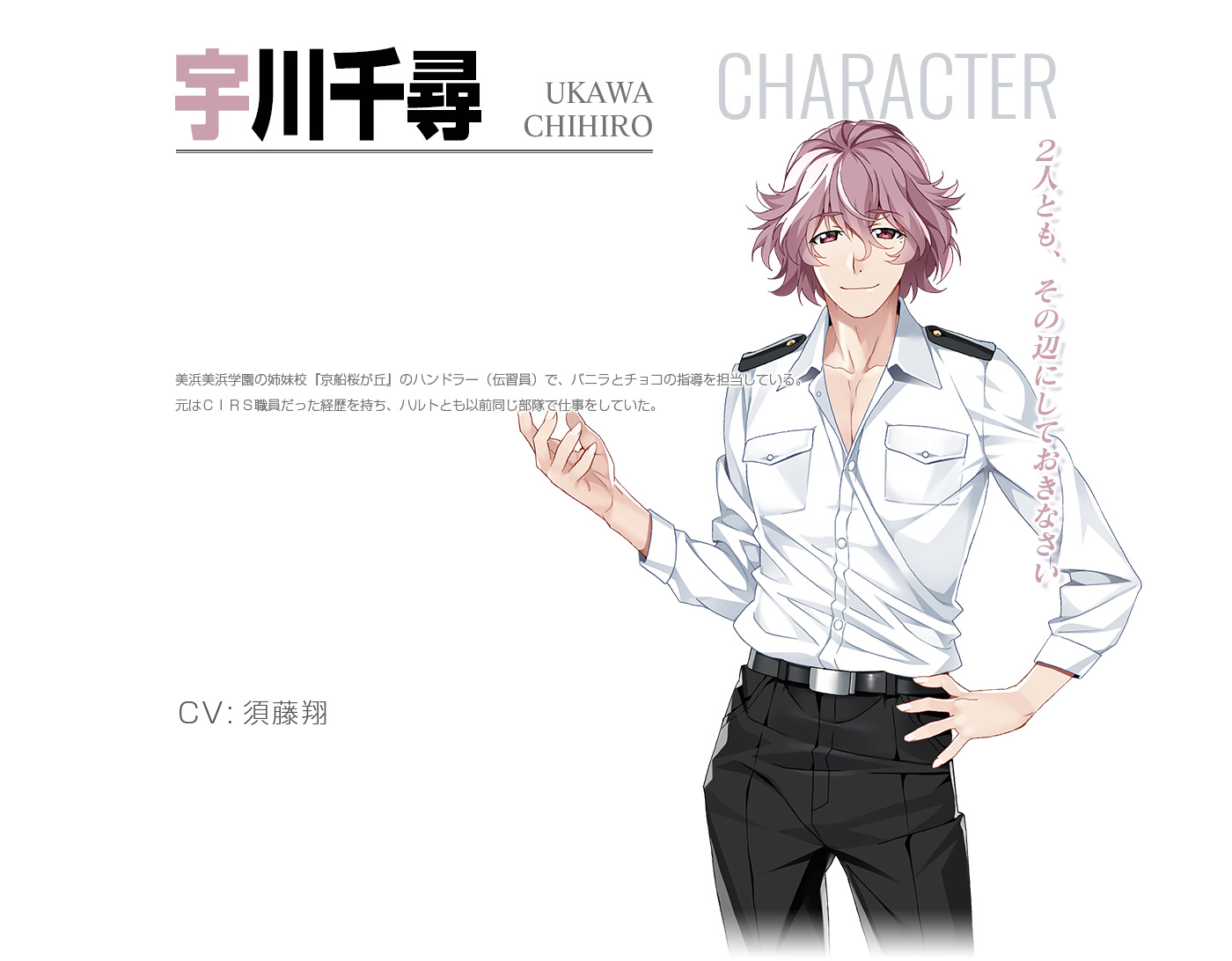 1boy armor belt black_belt black_pants breast_pocket buttons character_name character_profile closed_mouth collared_shirt cowboy_shot grisaia_(series) grisaia_phantom_trigger hair_between_eyes hand_on_own_hip long_sleeves looking_at_viewer male_focus official_art pants pauldrons pink_hair pocket red_eyes shirt shirt_tucked_in short_hair shoulder_armor shoulder_boards smile solo standing translation_request ukwawa_chihiro watanabe_akio white_background white_shirt