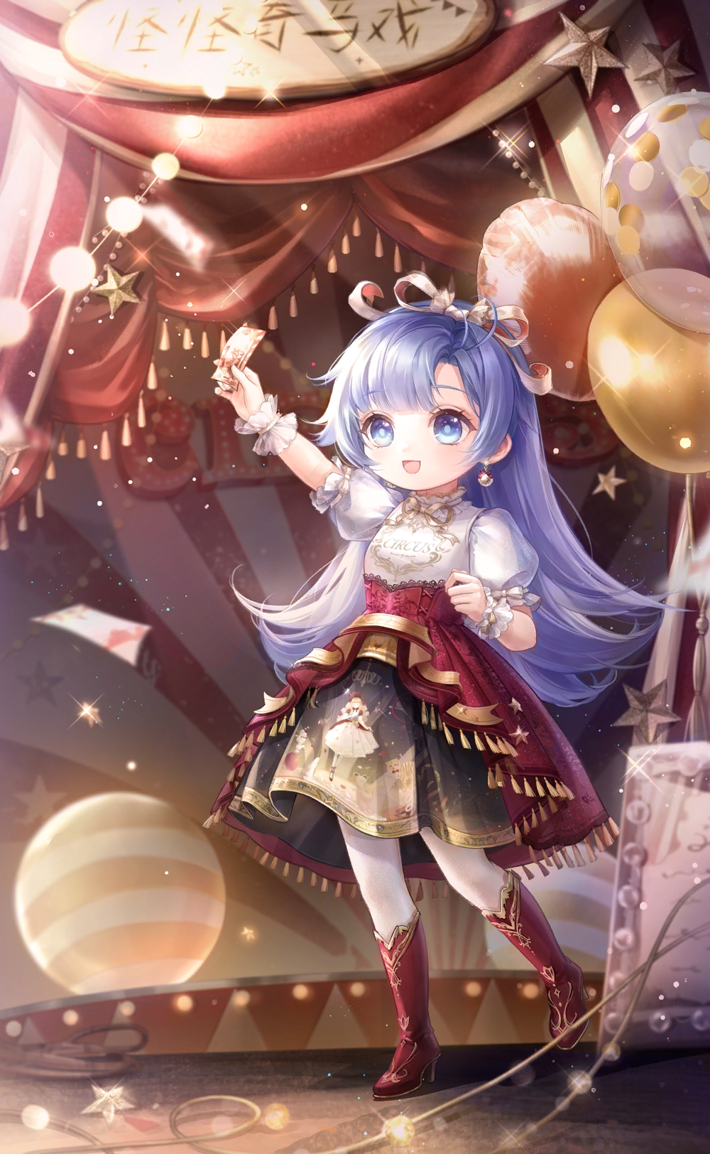 1girl arm_up artist_request ball balloon black_skirt blue_eyes blue_hair blunt_bangs boots bow child circus clenched_hand clothes_writing collared_shirt dot_nose earrings eyelashes floating_paper frilled_shirt_collar frilled_sleeves frilled_wrist_cuffs frills fringe_trim full_body game_cg hair_ribbon haley's_circus_(shining_nikki) happy high-waist_skirt high_heel_boots high_heels highres holding holding_ticket jewelry lace lace-trimmed_skirt lace_trim layered_skirt light_particles lolita_fashion long_hair marina_(shining_nikki) medium_skirt nikki_(series) official_art open_mouth pantyhose pink_ribbon puffy_short_sleeves puffy_sleeves red_boots red_skirt ribbon rope see-through_clothes see-through_pantyhose see-through_sleeves shadow shining_nikki shirt short_sleeves sign skirt sleeve_bow smile solo sparkle sphere_earrings standing star_(symbol) star_print stiletto_heels straight_hair string_of_light_bulbs tareme ticket very_long_hair white_bow white_pantyhose white_shirt wrist_bow wrist_cuffs yellow_bow yellow_ribbon yellow_wrist_cuffs