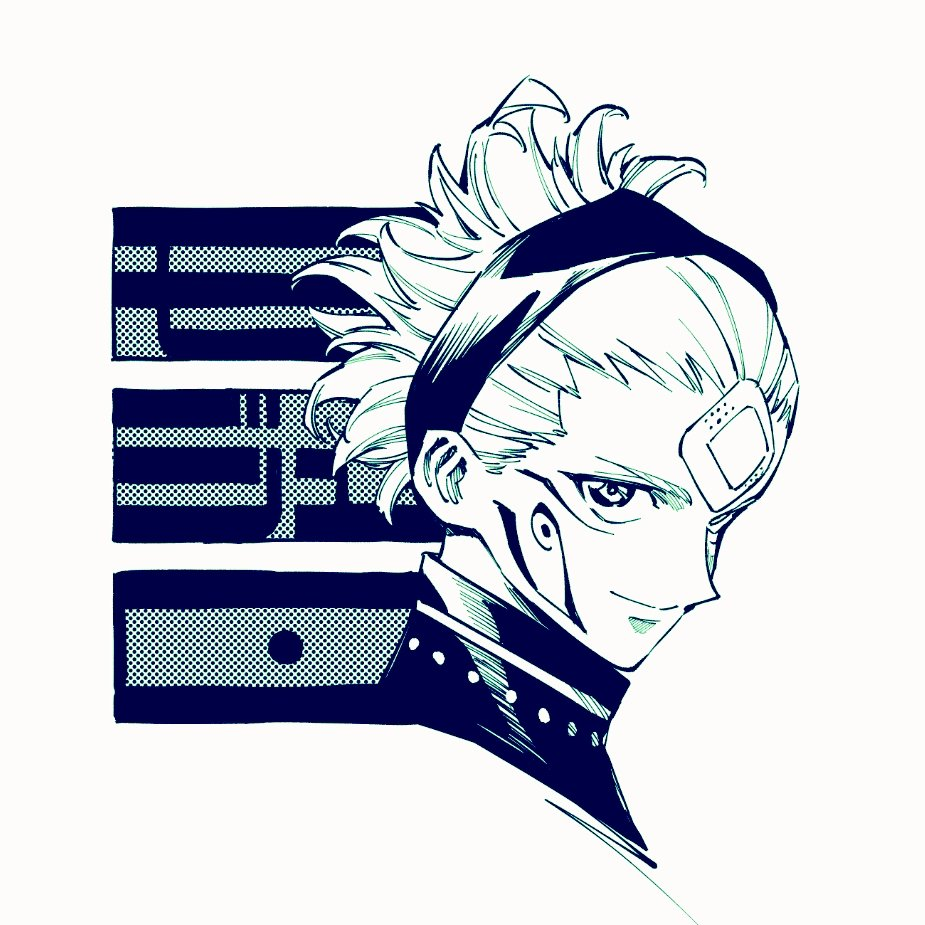 1boy bandaid bandaid_on_face bandaid_on_forehead black_hairband copyright_name facial_mark hairband iwasaki_yuuji jujutsu_kaisen jujutsu_kaisen_modulo male_focus marulu_val_vol_yelvori monochrome official_art portrait short_hair simple_background smile solo white_background