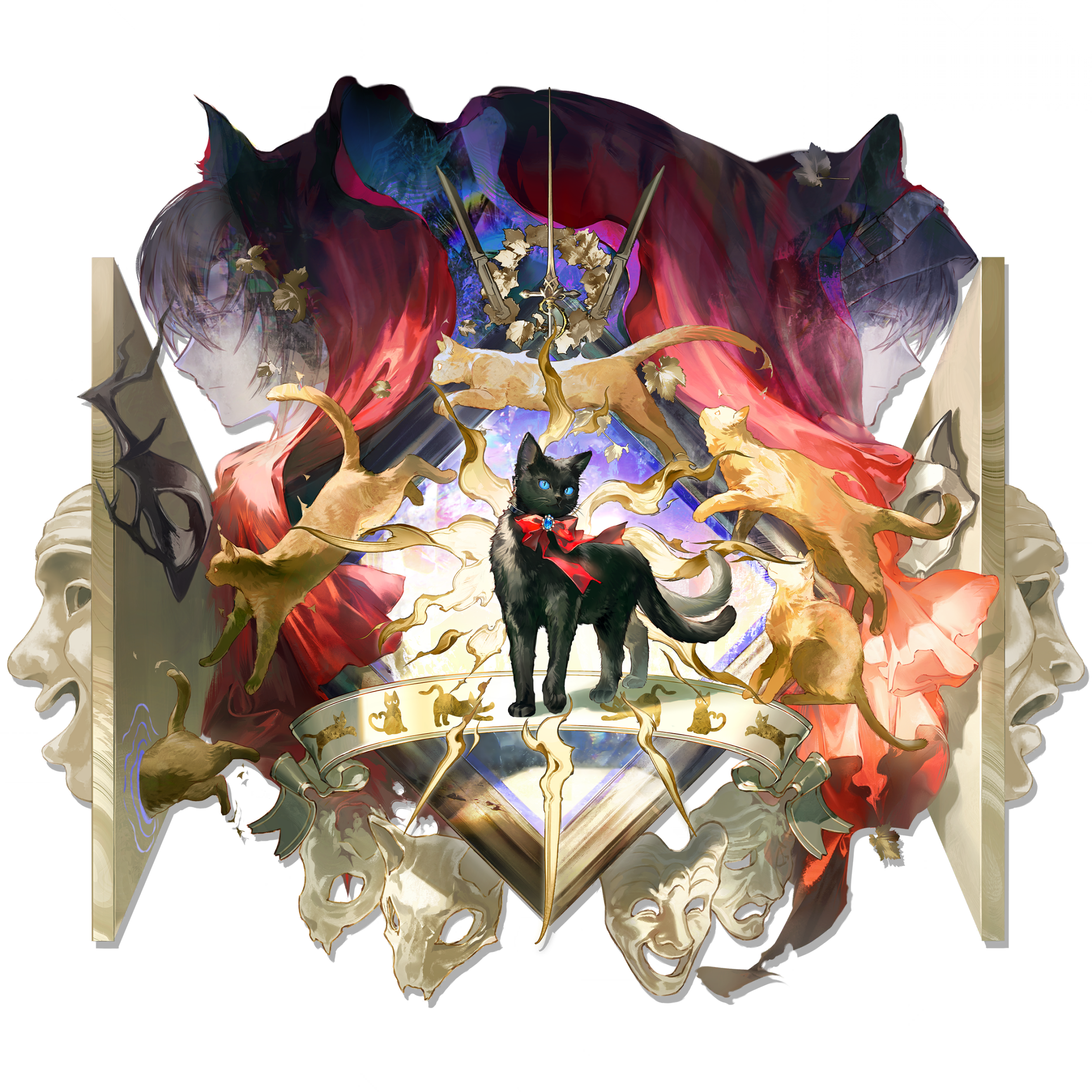 animal animal_focus arknights black_cat blue_eyes blue_gemstone bow bowtie brooch cat cat_stretch curtains full_body gem highres jewelry knife miss_christine_(arknights) multiple_tails nekomata official_art phantom_(arknights) red_bow red_bowtie sequential simple_background solo stage_curtains stretching sword tail third-party_source transparent_background two_tails weapon yuji_(fantasia)