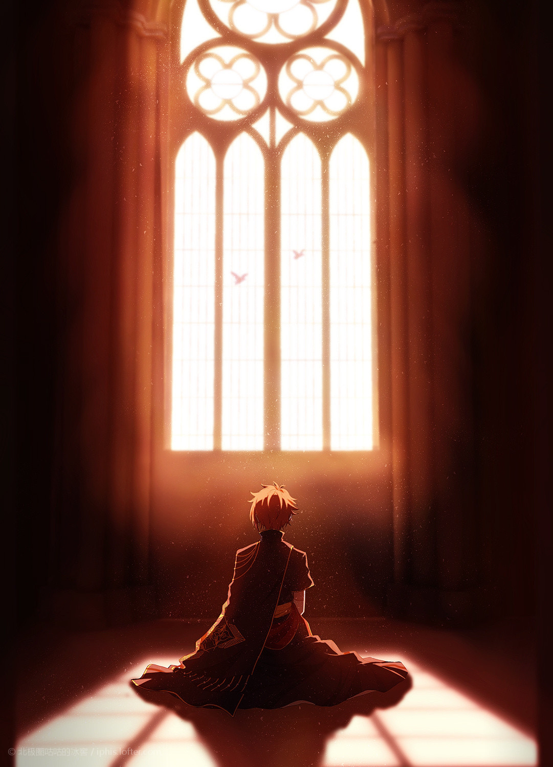 1boy bird brown_cape brown_cloak brown_kimono cang_(iphis233) cape cathedral church cloak crack_of_light dappled_sunlight day drop_shadow evening facing_away hands_on_own_knees highres idolish7 indoors japanese_clothes kimono kneeling light_particles looking_ahead looking_outside male_focus mansion nanase_riku on_ground pigeon red_hair sash seiza sitting stained_glass sunlight vignetting waist_sash