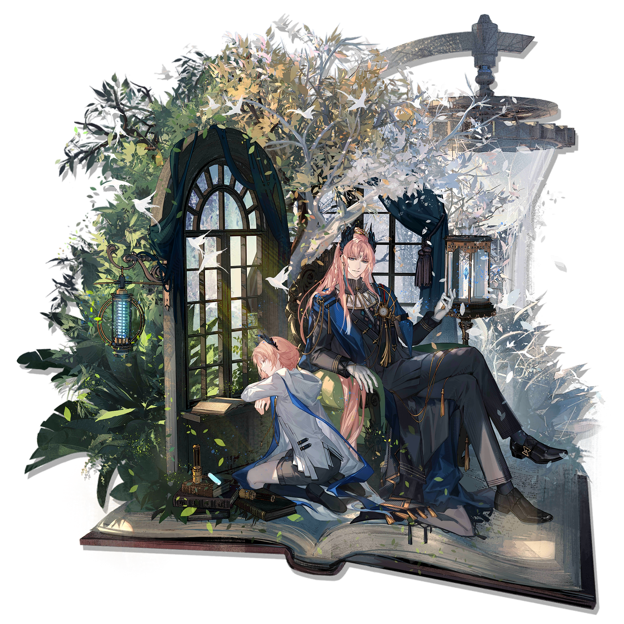 2boys against_windowsill age_comparison aged_down arknights armchair bird bird_boy bishounen black_shoes black_shorts black_socks black_tailcoat blue_eyes book braid chair closed_eyes closed_mouth curtains dual_persona formal_clothes full_body giant_book head_wings high_ponytail highres hood hooded_jacket jacket kneehighs lantern leaf long_hair looking_at_viewer male_focus multiple_boys official_alternate_costume official_art on_book open_book orange_hair pants parted_lips passenger_(arknights) passenger_(dream_in_a_moment)_(arknights) passenger_(young)_(dream_in_a_moment)_(arknights) pink_hair plant ponytail seasons seiza shoes short_hair shorts side_braid simple_background sitting skade sleeping smile socks tailcoat third-party_source transparent_background tree very_long_hair white_jacket window windowsill wings