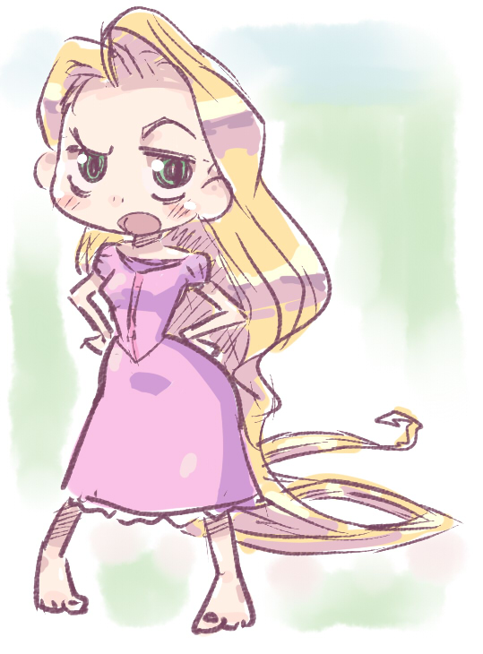 1girl barefoot blonde_hair blush breasts disney dress green_background green_eyes hands_on_own_hips k-nattoh long_hair looking_at_viewer open_mouth princess puffy_sleeves purple_dress raised_eyebrow rapunzel_(disney) rapunzel_(fairy_tale) short_sleeves small_breasts standing tangled very_long_hair