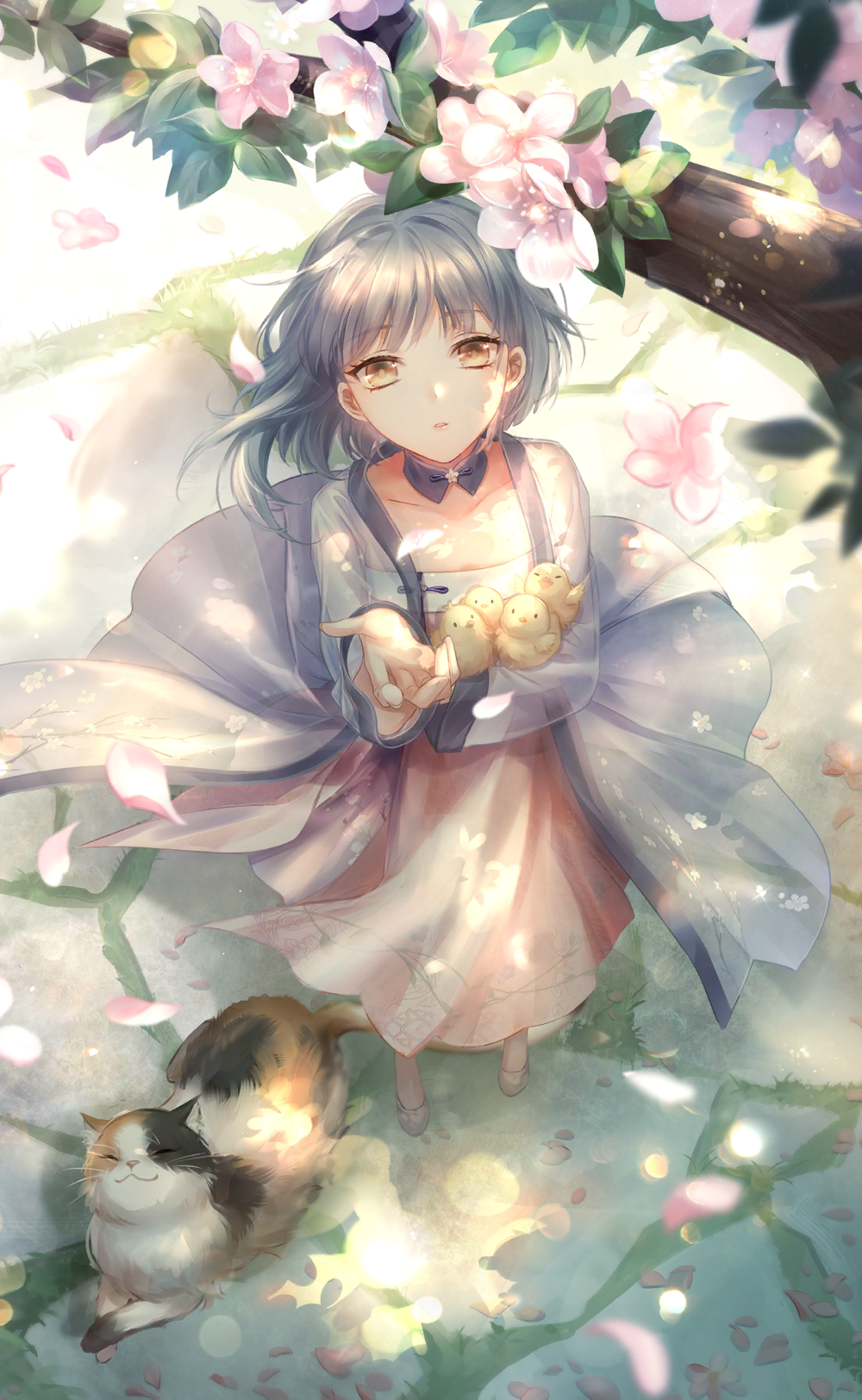 1girl animal artist_request baby_animal bird black_collar branch calico_(pattern) calico_cat catching cherry_blossoms chick chinese_clothes cobblestone collar collarbone day detached_collar dot_nose dress expressionless eyelashes floating_clothes floating_hair floral_print flower from_above full_body game_cg grey_hair highres holding holding_animal jacket light_blush light_particles long_dress mandarin_collar nikki_(series) official_art outdoors outstretched_hand parted_lips pink_dress pink_flower pleated_dress see-through_clothes see-through_jacket shade shining_nikki shoes short_hair_with_long_locks solo spring_(season) two-tone_dress white_dress white_jacket white_shoes wind yellow_eyes yexiao_(shining_nikki)