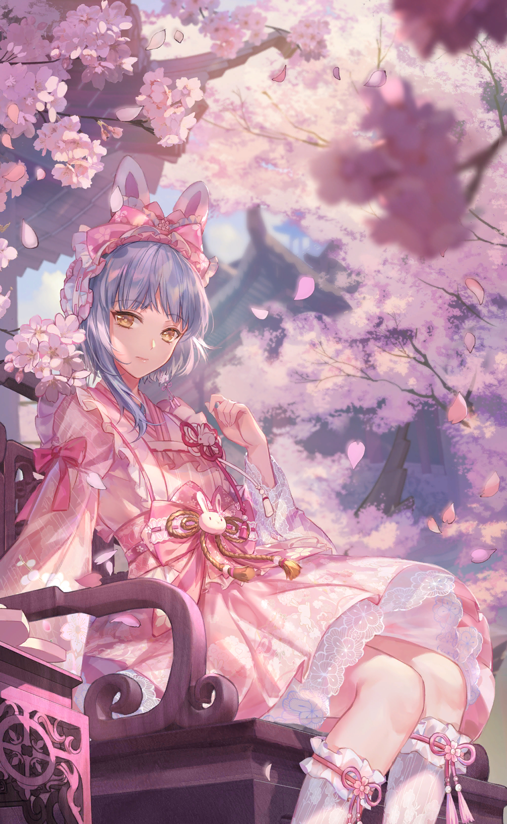 1girl animal_ear_hairband animal_ears architecture artist_request blue_sky blunt_bangs bow brooch brown_ribbon cherry_blossom_print cherry_blossoms closed_mouth cloud cowboy_shot dress east_asian_architecture expressionless fake_animal_ears falling_petals floral_print flower flower_knot frilled_bow frilled_hairband frilled_sash frilled_socks frilled_straps frills game_cg grey_hair hair_bow hair_flower hair_ornament hairband highres house japanese_clothes jewelry juliet_sleeves kneehighs knees lace lace-trimmed_dress lace_trim lipstick lolita_fashion lolita_hairband long_sleeves looking_at_viewer makeup medium_dress nikki_(series) obi official_art on_bench petals pink_bow pink_dress pink_flower pink_hairband pink_lips pink_ribbon pink_sash pink_theme puffy_sleeves rabbit_brooch rabbit_ear_hairband rabbit_ears red_ribbon ribbon ribbon-trimmed_sash ribbon_legwear sash see-through_clothes see-through_socks shining_nikki short_hair_with_long_locks single_sidelock sitting sky sleeve_bow smile socks solo spring_(season) spring_cherry_(shining_nikki) tassel tree wa_lolita waist_ribbon white_socks wide_sleeves yellow_eyes yexiao_(shining_nikki)