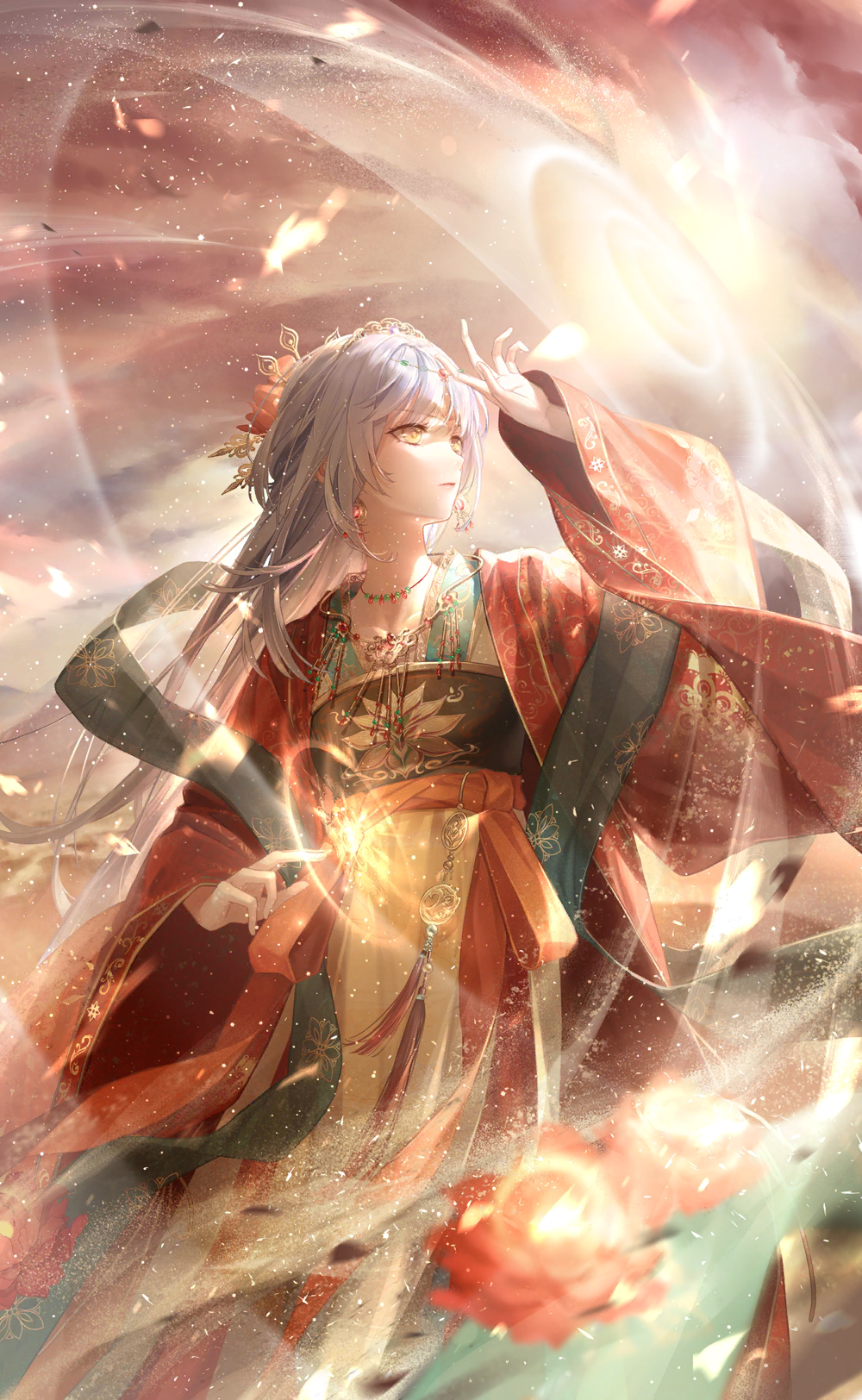 1girl aqua_shawl artist_request camellia chinese_hairpin circlet cloud cloudy_sky cowboy_shot earrings energy_barrier expressionless flower game_cg glamorous_nights_(shining_nikki) grey_hair hair_flower hair_ornament hairpin hand_on_own_head highres jewelry light_particles long_hair long_sleeves magic multiple_hairpins necklace nikki_(series) official_art outdoors parted_lips petals red_flower red_robe robe shawl shining_nikki sky solo standing sunset very_long_hair waist_tassel wide_sleeves yellow_eyes yellow_hanfu yexiao_(shining_nikki)