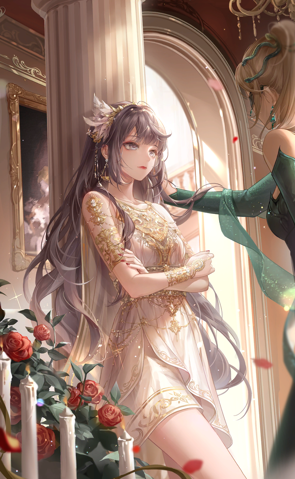 2girls against_pillar arch armlet artist_request blindfold blonde_hair blue_eyes bridal_gauntlets candle cape chandelier closed_mouth cowboy_shot crossed_arms doorway dress earrings expressionless eyeshadow face-to-face feather_hair_ornament feathers flower game_cg glowing_crown_(shining_nikki) gold_armlet greco-roman_clothes green_dress green_shawl grey_hair hair_ornament hairband highres indoors jewelry kabedon light_frown light_particles lilith_(shining_nikki) lipstick long_dress long_hair long_sleeves looking_at_another makeup misty_blue_veil_(shining_nikki) multiple_girls nikki_(series) official_art painting_(object) petals pink_eyeshadow ponytail red_flower red_lips red_rose rose rose_petals shawl shining_nikki short_dress sleeveless sleeveless_dress sleeves_past_wrists snake_hair_ornament stairs standing very_long_hair wavy_hair white_cape white_dress yellow_hairband zoey_(shining_nikki)
