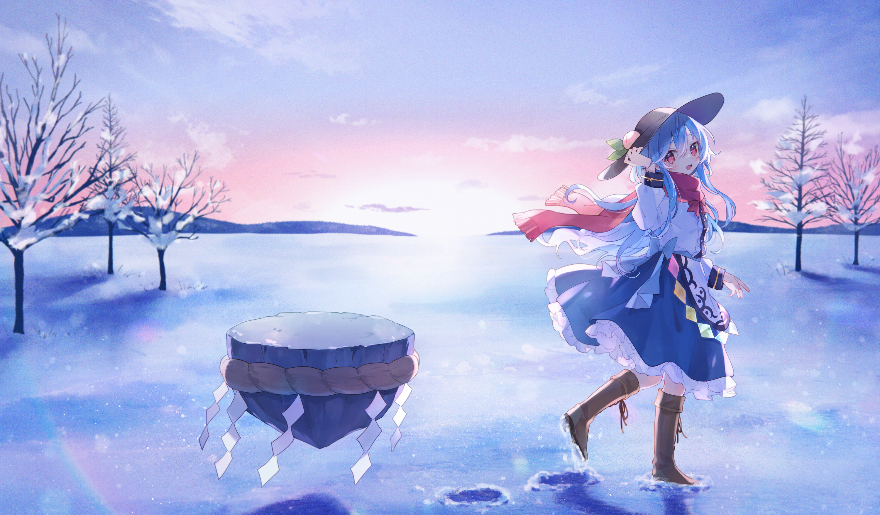 1girl :d apron black_hat blue_hair blue_skirt blue_sky blush boots brown_boots cloud cloudy_sky commentary_request dawn floating_rock footprints frilled_skirt frills from_side hand_on_headwear hat highres hill hinanawi_tenshi kaname-ishi light_particles long_hair long_sleeves looking_back merchandise_available nig_18 open_mouth outdoors peach_hat_ornament red_eyes red_scarf rope scarf shadow shide shimenawa shirt skirt sky smile snow solo touhou tree white_apron white_shirt