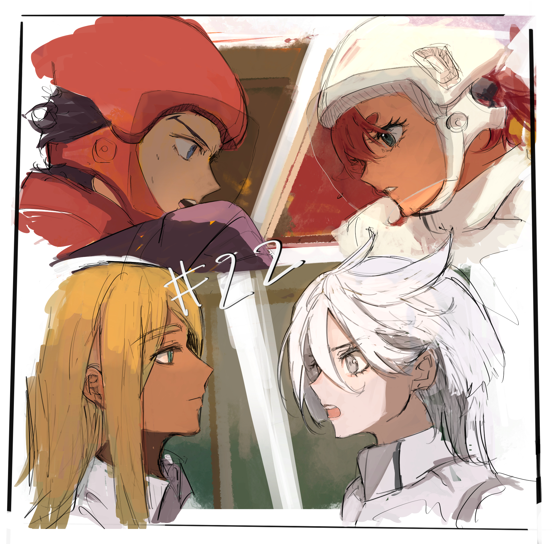 2boys 2girls blonde_hair blue_eyes commentary dark-skinned_male dark_skin fencing grey_eyes guel_jeturk gundam gundam_suisei_no_majo helmet highres long_hair looking_at_another miorine_rembran multiple_boys multiple_girls red_hair shaddiq_zenelli she_(morianosu) suletta_mercury thick_eyebrows white_hair