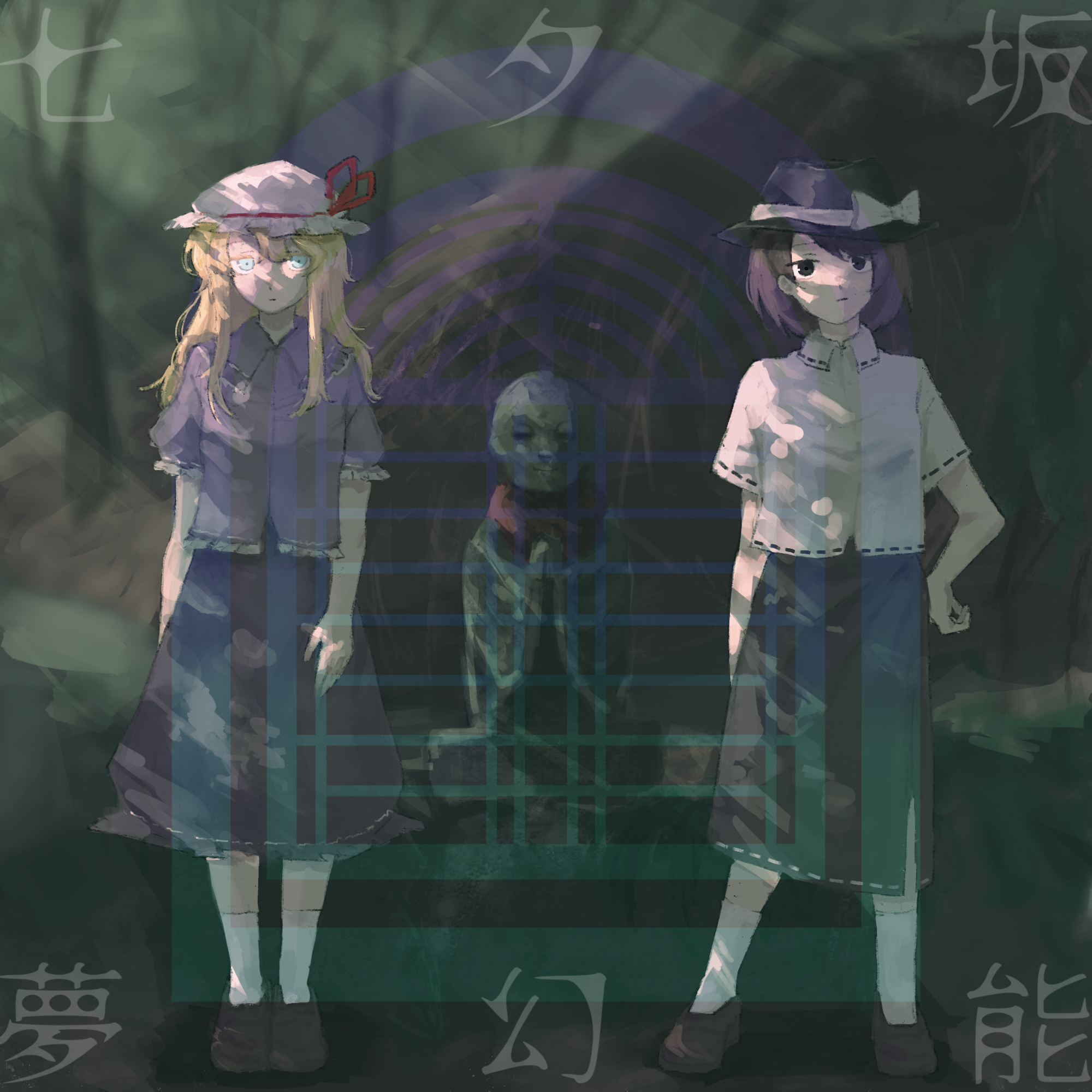 2girls bikini black_eyes black_hair black_hat black_shoes black_skirt blonde_hair blue_eyes bow closed_mouth collared_shirt expressionless fedora frilled_hat frilled_shirt frilled_shirt_collar frilled_sleeves frills hand_on_own_hip hat hat_bow hat_ribbon highres jizou long_hair maribel_hearn medium_skirt mob_cap multiple_girls outdoors puffy_short_sleeves puffy_sleeves purple_shirt purple_skirt ribbon shirt shoes short_hair short_sleeves skirt standing swimsuit taboo_japan_disentanglement touhou tree usami_renko variant_set white_bikini white_hat white_ribbon white_shirt yama_(hdvz4458)