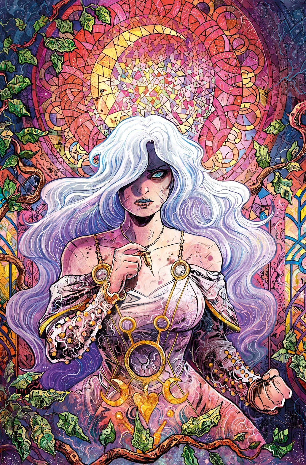 1girl architecture boom!_studios briar_(comic) cathedral church comic_cover cover cover_page dress european_architecture flower glass gown hair_over_one_eye highres indoors leaf long_hair medallion official_art plant princess rose sleeping_beauty_(fairy_tale) sleeping_beauty_(fairy_tale_character) solo spiked_sleeves stained_glass thorns vinartwork vines western_comics_(style)