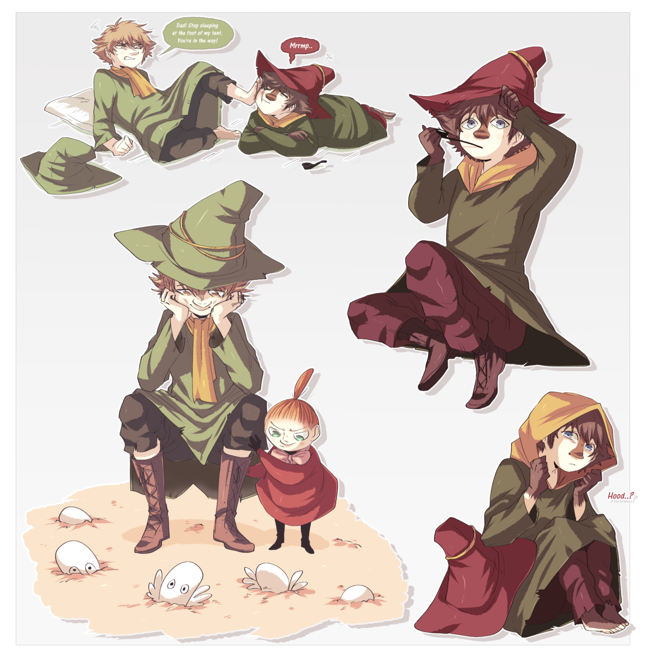 1boy 1girl 2boys barefoot blue_eyes brown_hair coat father_and_son green_coat green_hat hat hattifattener hiffuu highres hood hood_up joxter little_my mini_person minigirl moomin multiple_boys pillow red_hat short_hair smoking_pipe snufkin