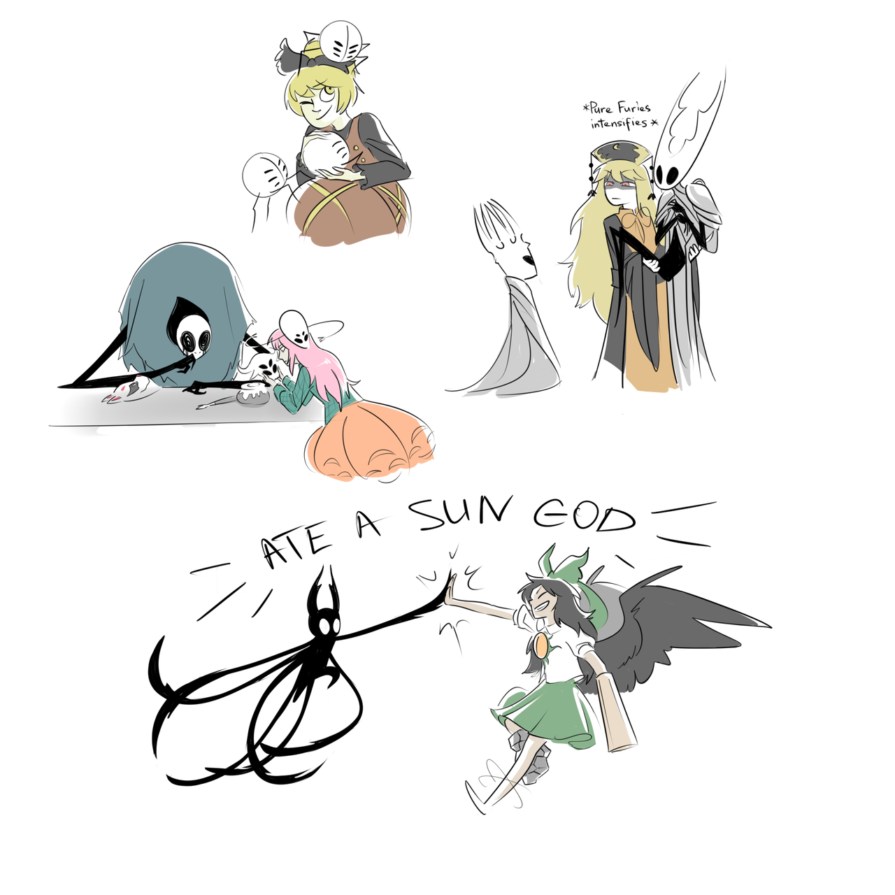 1boy 3others 4girls angry aqua_shirt arm_cannon armor atom azanny bird_wings black_skin black_wings blonde_hair bow brown_bow brown_dress bug carrying carrying_person closed_mouth colored_skin commentary creature_on_head crossover dalachi_(headdress) dress english_commentary english_text fox_mask green_bow green_skirt grey_cloak hair_bow hashtag-only_commentary hata_no_kokoro high_five highres holding holding_mask hollow_eyes hollow_knight hollow_knight_(character) horned_mask junko_(touhou) knight_(hollow_knight) kurodani_yamame long_hair mask mask_maker_(hollow_knight) mask_on_head multiple_girls multiple_others one_eye_closed orange_skirt pale_king_(hollow_knight) pinafore_dress pink_hair plaid_clothes plaid_shirt princess_carry pure_vessel reiuji_utsuho shaded_face shirt shoulder_armor skirt sleeveless sleeveless_dress smile spider third_eye third_eye_on_chest touhou unworn_mask very_long_hair weapon weaverling_(hollow_knight) white_mask wings yellow_eyes
