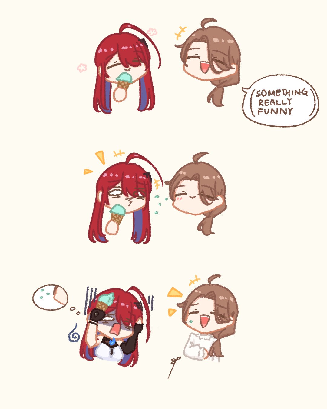 +++ 2girls =_= ahoge brain_freeze brown_hair commentary elizabeth_rose_bloodflame elizabeth_rose_bloodflame_(1st_costume) english_commentary english_text food highres hololive hololive_english ice_cream long_hair multiple_girls open_mouth ponytail red_hair sappysque shaded_face smile spit_take spitting upper_body virtual_youtuber