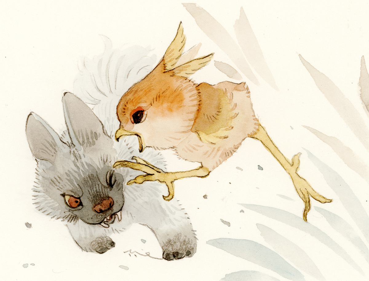 bird body_fur fangs fighting gen_3_pokemon grey_fur myun_(moukin_no_ana) nintendo no_humans one_eye_closed orange_feathers pokemon pokemon_(creature) pokemon_focus pokemon_rse poochyena torchic