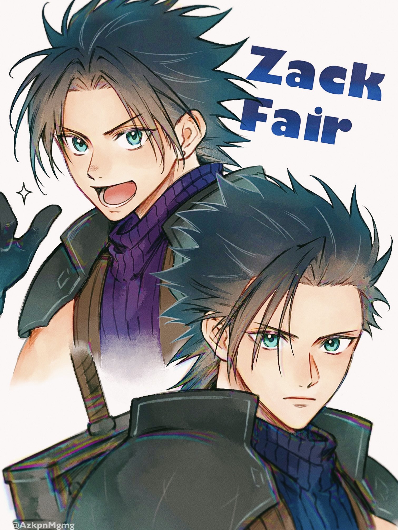 1boy 3wa_tari age_comparison aqua_eyes armor black_gloves black_hair blue_shirt buster_sword character_name closed_mouth crisis_core:_final_fantasy_vii earrings final_fantasy final_fantasy_vii gloves hair_slicked_back highres jewelry light_frown looking_at_viewer male_focus open_mouth parted_bangs pauldrons purple_shirt shirt short_hair shoulder_armor single_earring sleeveless sleeveless_turtleneck smile sparkle suspenders sword sword_on_back thumbs_up turtleneck twitter_username upper_body weapon weapon_on_back white_background zack_fair