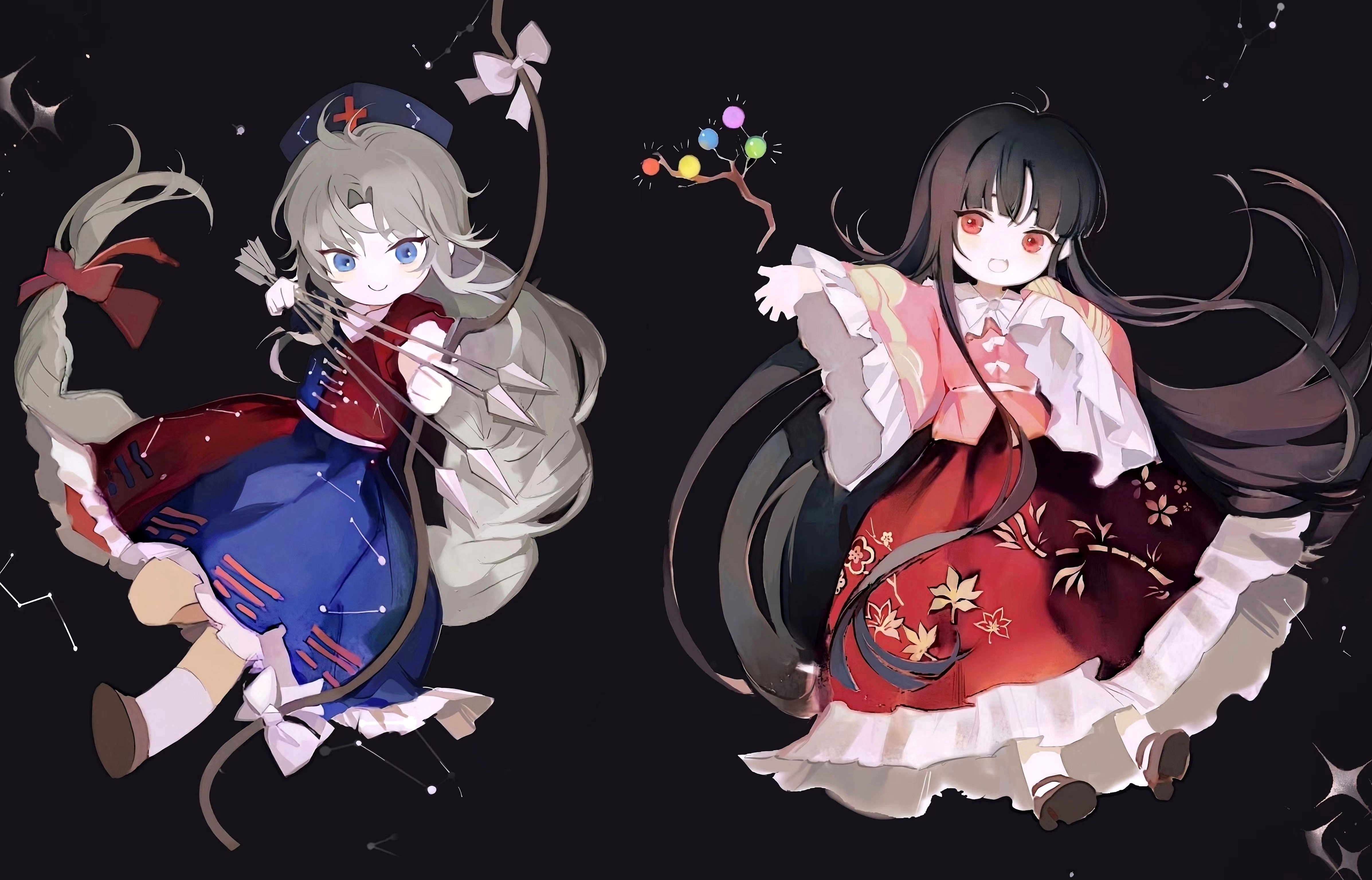 2girls :d absurdres ahoge arrow_(projectile) bamboo_print black_background black_hair blue_dress blue_eyes blue_hat bow bow_(weapon) bowtie braid braided_ponytail branch brown_shoes chibi chibi_only collar commentary_request constellation constellation_print cross dress fang floral_print floral_print_skirt frilled_sleeves frills grey_hair gu_yue_yuan hair_bow hat highres houraisan_kaguya jeweled_branch_of_hourai leaf_print long_hair long_skirt long_sleeves multiple_girls open_mouth petticoat print_skirt red_bow red_cross red_dress red_eyes red_skirt shoes short_sleeves skin_fang skirt smile socks touhou two-tone_dress very_long_hair weapon white_bow white_bowtie white_collar white_socks yagokoro_eirin