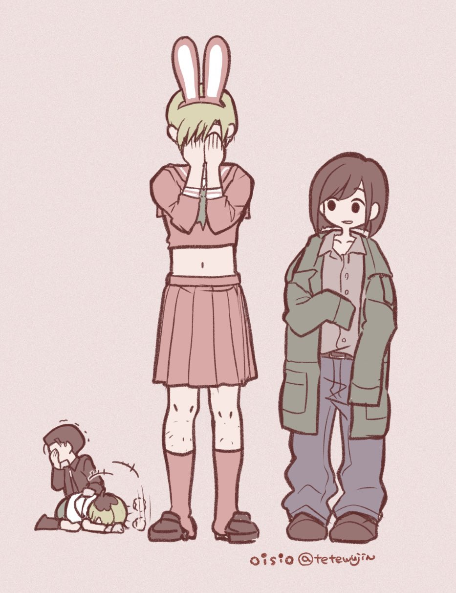 animal_ear_hairband animal_ears artist_name blonde_hair blue_pants brown_hair brown_shoes collared_shirt cosplay crossdressing crossdressing_(mtf) fake_animal_ears father_and_daughter full_body green_jacket grey_background grey_shirt hairband hand_on_another's_back hand_over_face hands_on_own_face harry_mason heather_mason highres hood hoodie jacket james_sunderland james_sunderland_(cosplay) laughing leg_hair midriff navel oisiso pants parted_lips pink_sailor_collar pink_serafuku pink_shirt pink_skirt pink_socks pleated_skirt rabbit_ears sailor_collar school_uniform serafuku shimizu_hinako shimizu_hinako_(cosplay) shimizu_hinako_(pink_rabbit_costume) shirt shoes silent_hill silent_hill_(series) silent_hill_2 silent_hill_3 silent_hill_f skirt sleeves_past_fingers sleeves_past_wrists socks standing trembling twitter_username white_hoodie