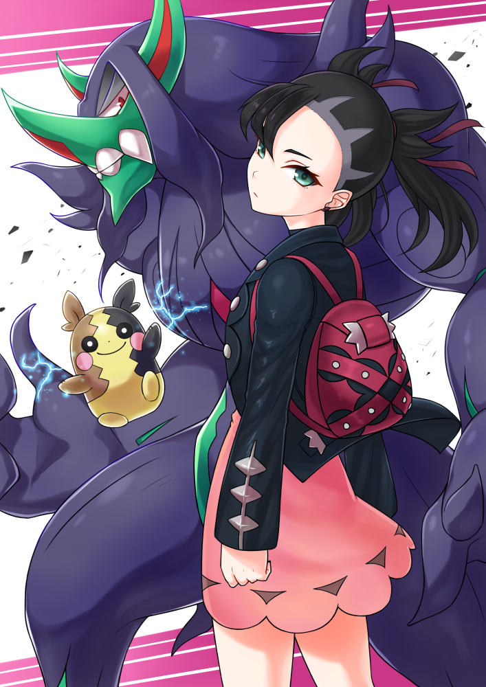 1girl asymmetrical_bangs backpack bag black_hair black_jacket commentary_request dress earrings electricity floating_hair from_behind gen_8_pokemon green_eyes grimmsnarl hair_ribbon head_tilt jacket jewelry kuzumochi_soyo looking_at_viewer looking_back marnie_(pokemon) morpeko morpeko_(full) nintendo pink_dress pokemon pokemon_(creature) pokemon_swsh red_ribbon ribbon standing stud_earrings twintails undercut