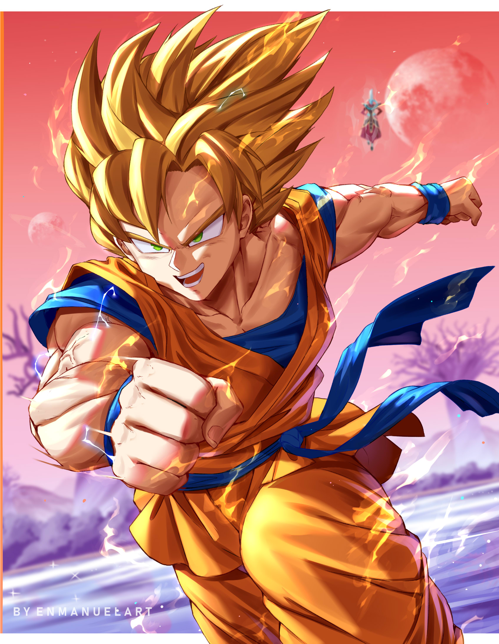 1boy artist_name blonde_hair blue_rope blue_tank_top blurry blurry_background border bracelet character_request check_copyright clenched_hands collarbone commentary copyright_request dragon_ball english_commentary enma_(enmanuelart) feet_out_of_frame full_moon gradient_sky green_eyes highres jewelry light_particles looking_to_the_side male_focus medium_hair moon multiple_moons muscular muscular_male nose open_mouth orange_pants orange_robe orange_sky outdoors outside_border outstretched_arm pants robe rope rope_around_waist running sky solo_focus son_goku sparkle sparkling_aura spiked_hair tank_top teeth tongue veins watermark white_border