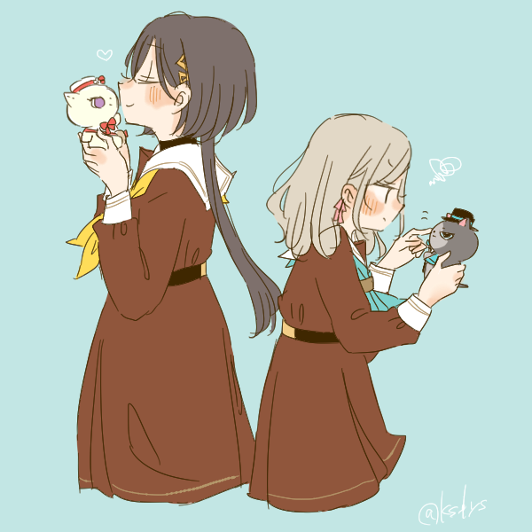 2girls aqua_neckerchief black_hair blue_background brown_dress ceras_yanagida_lilienfeld closed_mouth commentary dress edel_note grey_hair hair_ornament hair_ribbon hasu_no_sora_school_uniform heart holding holding_stuffed_toy jellyfish_cut kase_(ks_lys) katsuragi_izumi link!_like!_love_live! long_hair long_sleeves looking_at_doll love_live! multiple_girls neckerchief pink_ribbon profile ribbon sailor_collar sailor_dress school_uniform simple_background smile squiggle stuffed_animal stuffed_cat stuffed_toy triangle_hair_ornament v-shaped_eyes virtual_youtuber white_sailor_collar winter_uniform yellow_neckerchief