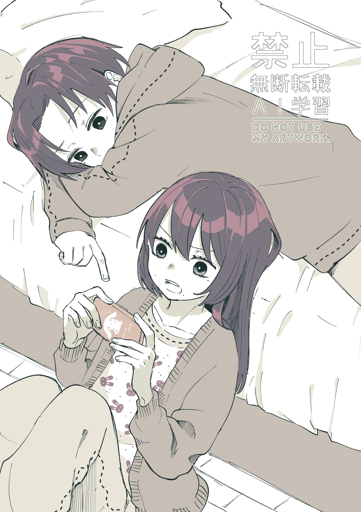 1boy 1girl bedroom bright_pupils brother_and_sister cardigan cellphone collarbone commentary_request futsuu_no_keion-bu highres holding holding_phone hood hood_down hoodie indoors kameya_kazushi kameya_san kanminec0 knees_up long_hair lying mole mole_on_cheek mole_under_eye mole_under_mouth monochrome on_bed on_stomach open_cardigan open_clothes pants parted_bangs phone pointing sepia shirt short_hair siblings sitting smartphone twins watermark white_pupils