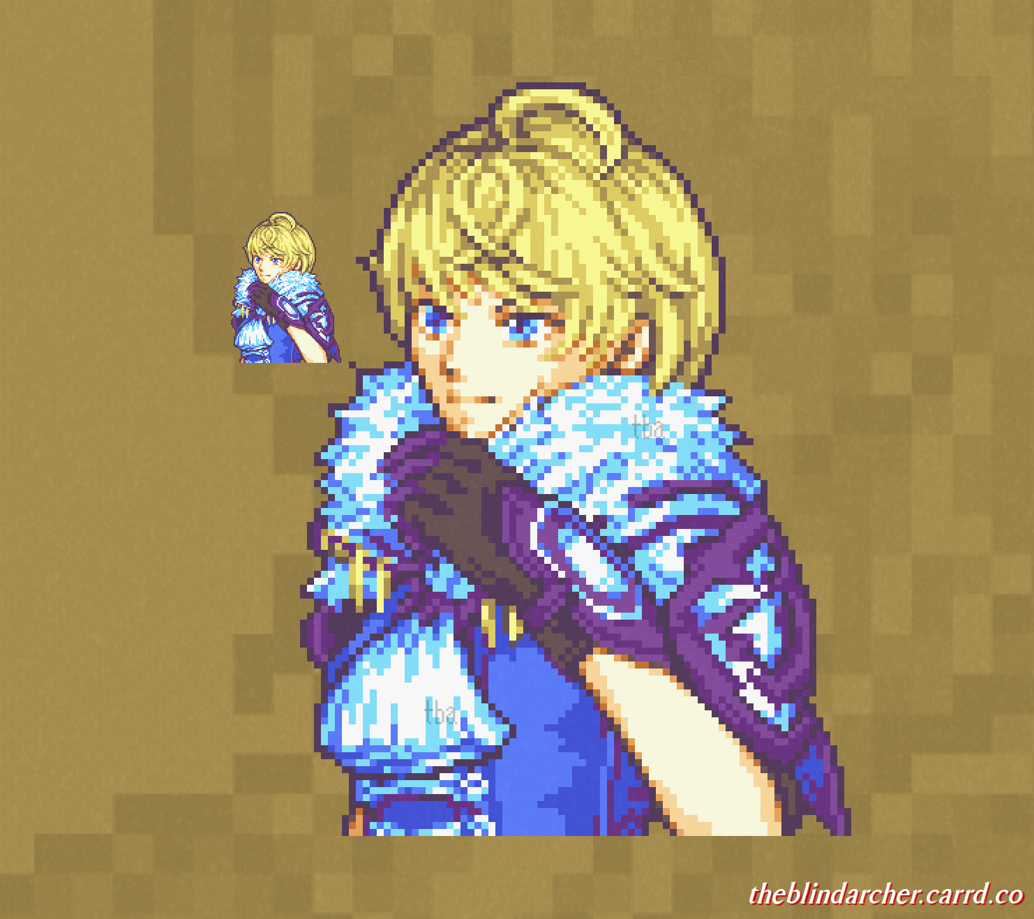 1girl ahoge ascot blonde_hair blue_eyes blue_shirt breasts fire_emblem fire_emblem_engage gloves highres merrin_(fire_emblem) nintendo pelt pixel_art shirt short_hair small_breasts smile solo theblindarcher white_ascot