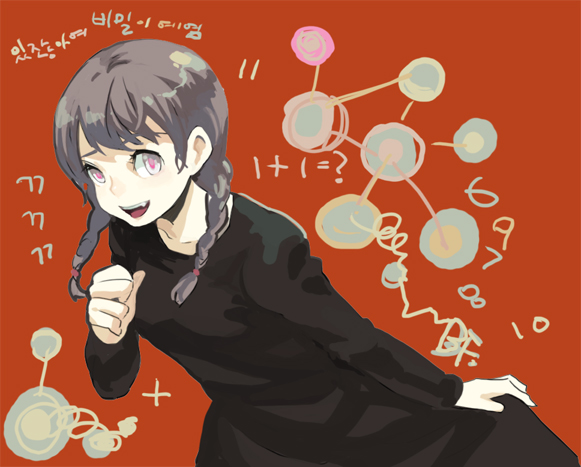 1girl archived_source artist_name bf._(sogogiching) black_dress black_mouth black_sleeves braid breasts collarbone commentary_request dress eyelashes fang grey_hair hair_tie impasto korean_commentary looking_at_viewer math medium_breasts no_lineart open_mouth original pink_pupils red_background signature solo tongue translation_request twin_braids twintails upper_body white_eyes