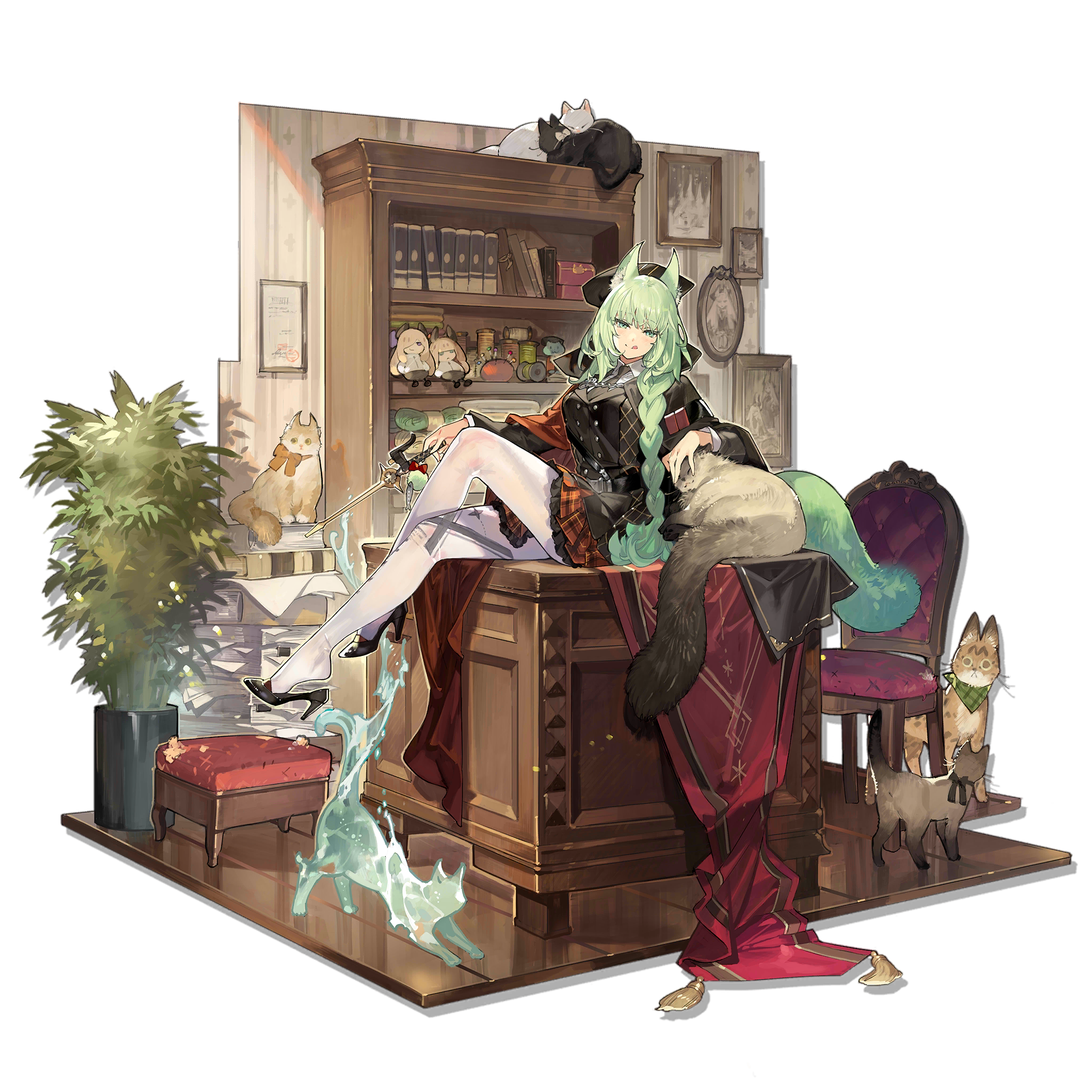 1girl :q animal_ears arknights black_cat black_hat book bookshelf braid cameo cat cat_ears cat_girl cat_tail character_doll crossed_legs doll full_body green_eyes green_hair green_tail harmonie_(arknights) harmonie_(invitation)_(arknights) hat highres holding holding_wand indoors long_hair looking_at_viewer multiple_cats necktie necrass_(arknights) official_alternate_costume official_alternate_hairstyle official_art pantyhose plaid_clothes plaid_skirt red_skirt reed_(arknights) simple_background skirt solo starshadowmagician tail third-party_source tongue tongue_out too_many too_many_cats transparent_background very_long_hair wand white_cat white_pantyhose