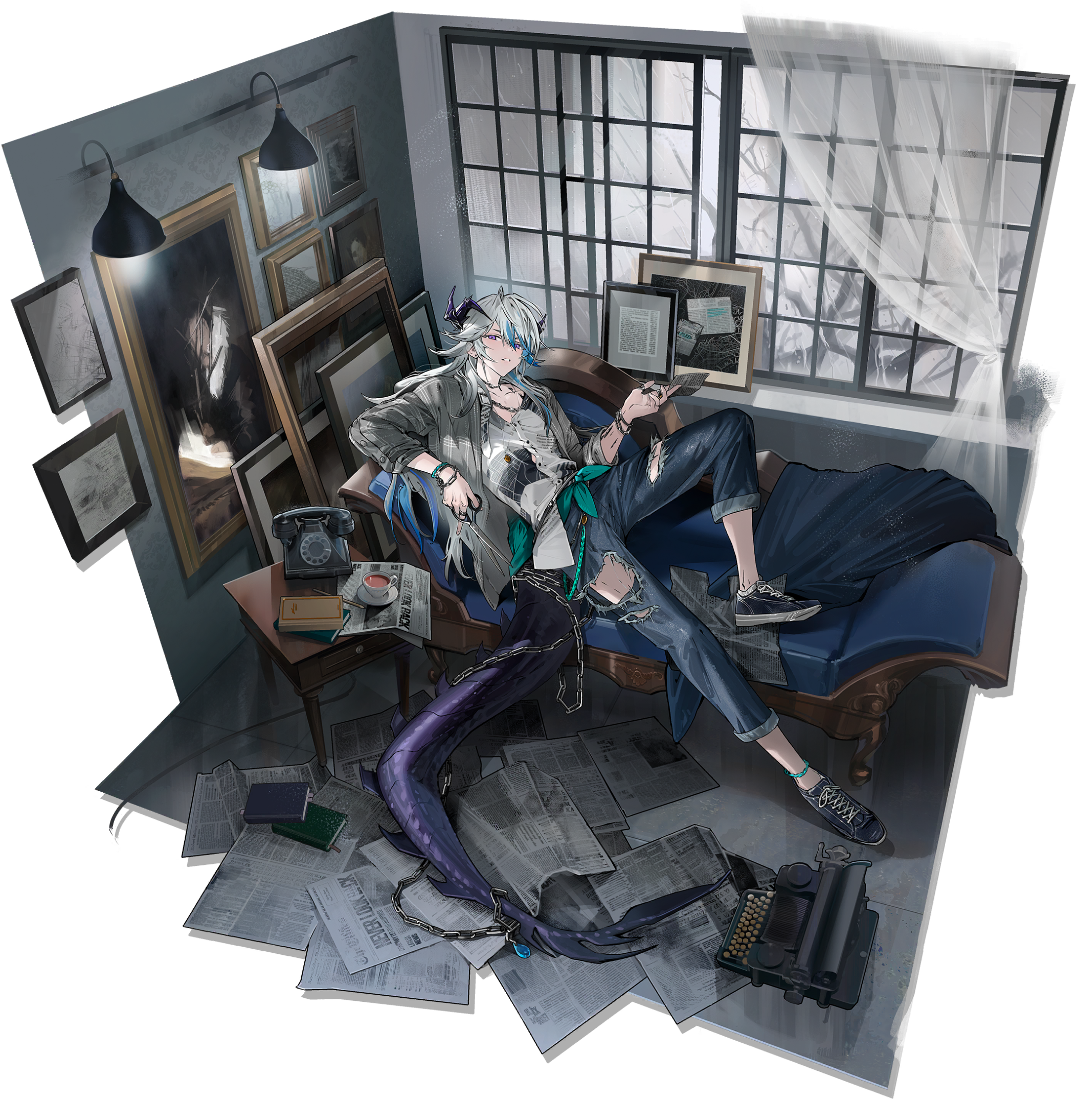 1boy antique_phone arknights bishounen black_tea blue_hair bracelet chain chain_bracelet clenched_teeth denim dragon_boy dragon_horns dragon_tail full_body grey_jacket grey_shirt highres holding holding_scissors horns indoors jacket jeans jewelry kaninn looking_at_viewer male_focus multiple_rings newspaper official_alternate_costume official_art open_clothes open_jacket pants phone picture_frame plaid_clothes plaid_jacket print_shirt purple_eyes purple_horns purple_tail puzzle_(amidst_the_pieces)_(arknights) puzzle_(arknights) ring rotary_phone scissors shirt simple_background solo tail tea teeth third-party_source torn_clothes torn_jeans torn_pants transparent_background typewriter white_hair