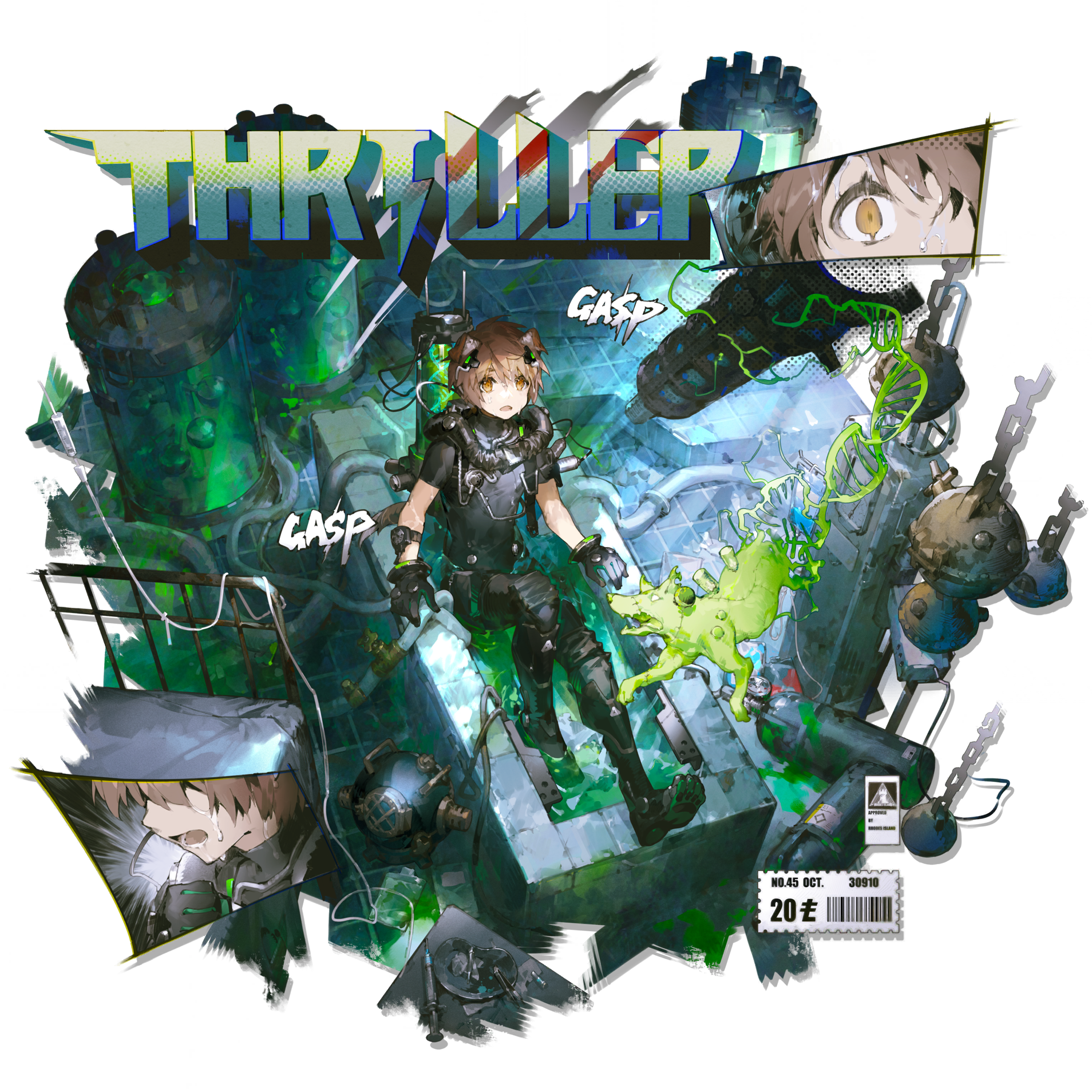 1boy animal_ears arknights armored_boots barcode bishounen black_bodysuit black_boots black_gloves bodysuit boots brown_eyes brown_hair chain coughing diving_helmet diving_suit dna dog dog_boy dog_ears dog_tail earpiece ears_down english_text floppy_ears full_body gas_cylinder gloves green_liquid green_theme greyy_(arknights) greyy_the_lightningbearer_(arknights) greyy_the_lightningbearer_(biochemical_submergence)_(arknights) halftone helmet highres in_bathtub indoors intravenous_drip knee_guards laboratory male_focus multiple_views official_alternate_costume official_art open_mouth oxygen_tank pressure_gauge price rhodes_island_logo_(arknights) scorpion5050 short_hair simple_background sitting skin_tight solo sound_effects stasis_tank syringe tail third-party_source title transparent_background tube western_comics_(style) wet wristband yellow_eyes