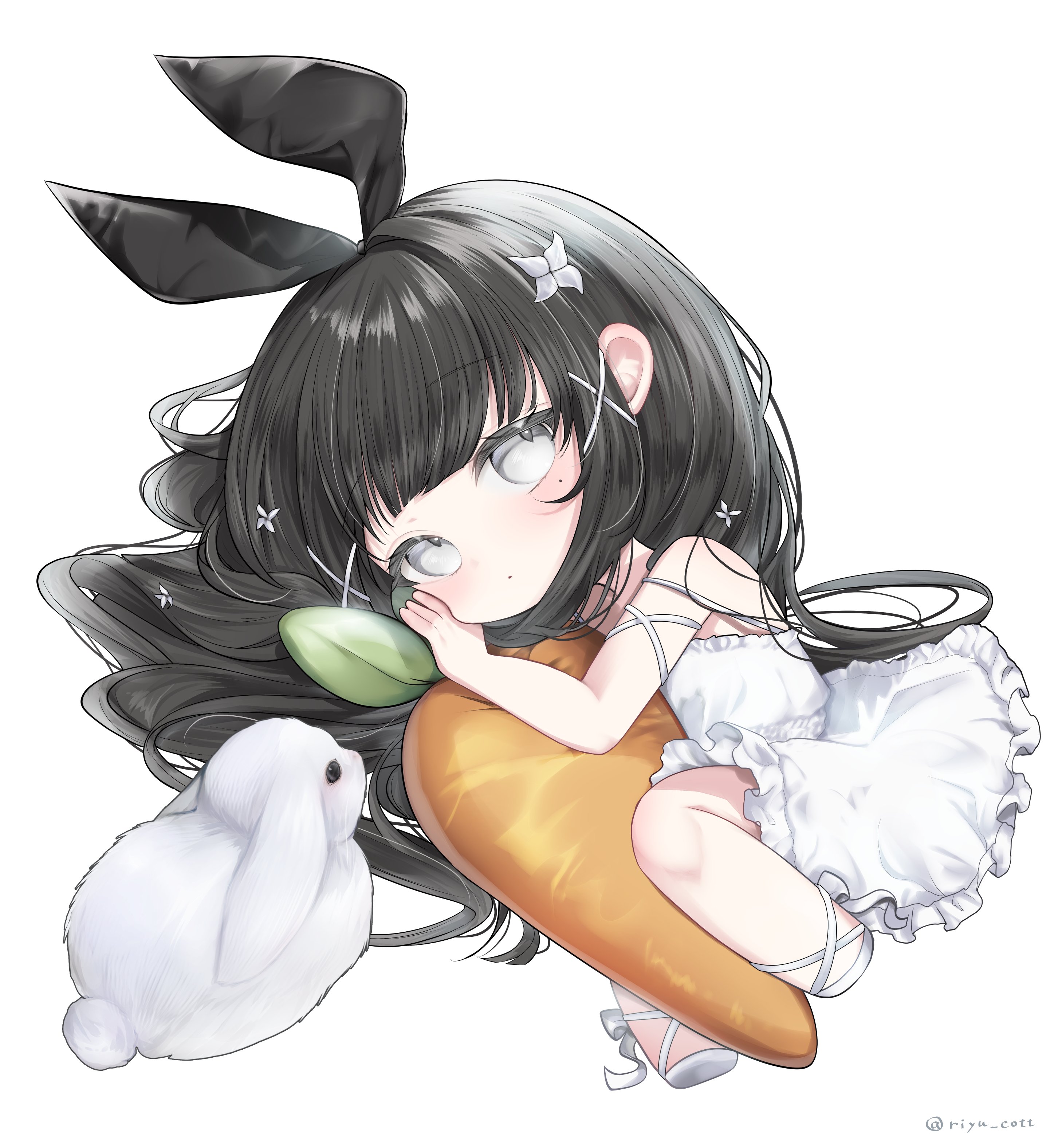 1girl absurdres animal animal_ears artist_name bare_legs bare_shoulders between_legs black_hair blunt_bangs body_pillow chibi chibi_only closed_mouth dot_mouth dress empire_waist expressionless facing_viewer fake_animal_ears floppy_ears frilled_dress frills hair_ornament hair_spread_out highres hugging_object knees light_blush long_hair looking_to_the_side lying mole mole_under_eye on_side original pillow pillow_hug rabbit rabbit_ears riyu_cott shoes sidelocks simple_background sleeveless sleeveless_dress solo spaghetti_strap straight_hair stuffed_carrot sundress twitter_username very_long_hair white_background white_dress white_eyes white_rabbit_(animal) white_shoes x_hair_ornament