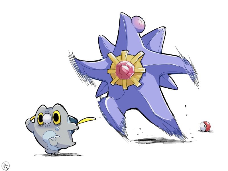 2others frigibax gen_1_pokemon injury mega_pokemon mega_starmie motion_lines multiple_others nintendo no_humans poke_ball poke_ball_(basic) pokemon pokemon_(creature) pokemon_focus rokushima113 running simple_background star_(symbol) starmie white_background
