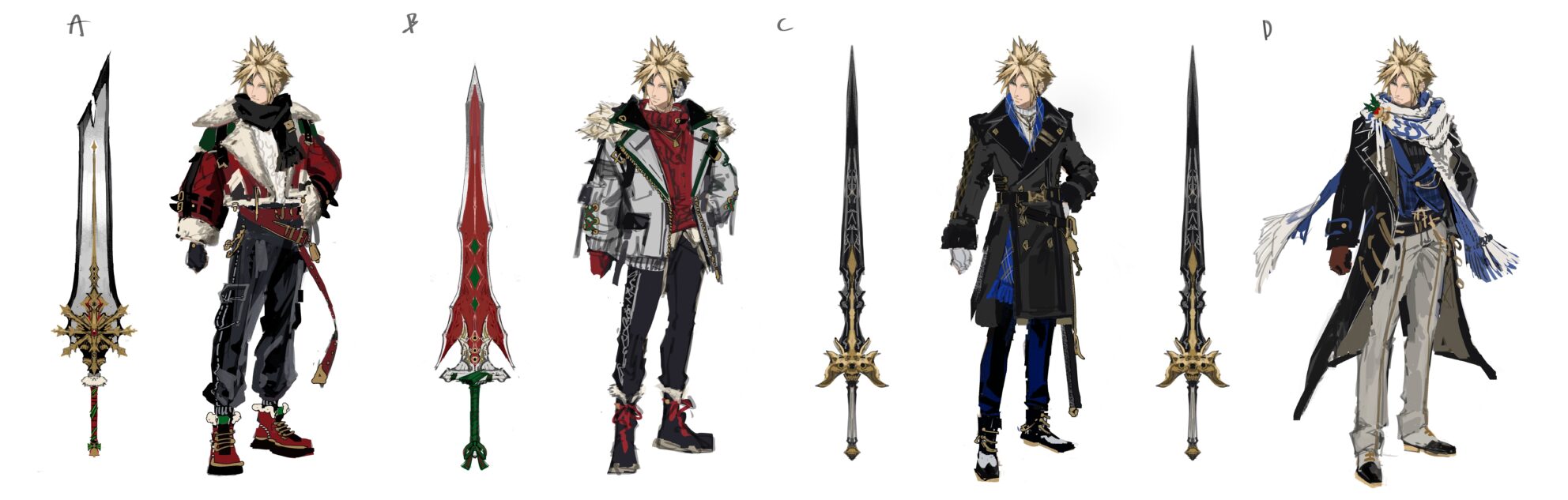 1boy belt black_belt black_boots black_coat black_gloves black_pants black_sclera black_sweater blonde_hair blue_scarf blue_vest boots brown_gloves cable_knit cloud_strife cloud_strife_(holiday_outfit) coat colored_sclera dress_shoes earmuffs final_fantasy final_fantasy_vii final_fantasy_vii:_ever_crisis full_body fur-trimmed_coat fur_trim gloves gold_trim green_socks grey_coat grey_gloves grey_pants hand_on_own_hip highres knit_sweater male_focus mistletoe multiple_views official_alternate_costume official_art pants parted_bangs prototype_design red_boots red_coat red_gloves red_sweater scarf shoes short_hair socks solo spiked_hair standing sweater sword vest waistcoat weapon white_background white_scarf white_shoes white_sweater
